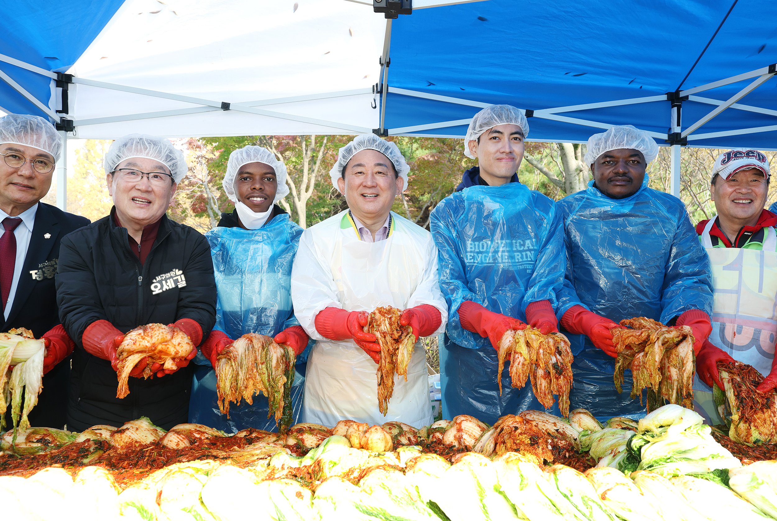 외국인_유학생_김장행사_참가_장면(사진제공=대전서구) [PEDIEN] 대전 서구가 외국인 유학생들과 함께 김장 나눔 행사를 열고 따뜻한 겨울맞이에 나섰다.지난 6일 둔산동 샘머리공원에서 열린 '함께하는 기쁨, 사랑 가득 김장 나눔'행사에는 배재대학교에 재학 중인 16개국 30여명의 외국인 유학생들이 참여했다.이번 행사는 서구가 매년 외국인 주민을 대상으로 진행하는 '한국문화교실'의 일환으로 유학생들이 김장 담그기 및 나눔 활동을 통해 한국의 전통 문화를 체험하고 이웃 사랑의 정신을 배울 수 있도록 기획됐다.인도네시아, 케냐, 르완다, 탄자니아 등 다양한 국가에서 온 유학생들은 밝은미래연합 사회봉사모임, 배재대학교 재능봉사단과 함께 김치 속재료를 버무리고 포장하는 등 김장 전 과정을 직접 체험하며 구슬땀을 흘렸다.이날 담근 김치는 지역 내 어려운 이웃들에게 전달되어 따뜻한 정을 나누었다.행사에 참여한 유학생들은 “직접 담근 김치를 이웃에게 전달한다는 점이 매우 인상 깊었다”며 “한국의 나눔 문화와 공동체 정신을 깊이 느낄 수 있었다”고 소감을 밝혔다.서철모 서구청장은 “서구는 매년 정부 초청 외국인 장학생들에게 한국의 다양한 문화를 체험할 기회를 제공하고 있다”며 “이들이 한국에서의 경험을 바탕으로 세계 각국에서 우호와 교류의 가교 역할을 할 수 있도록 지속적으로 지원하겠다”고 말했다.한편 정부초청외국인장학생은 교육부 산하 국립국제교육원이 주관하는 국제 장학사업으로 세계 각국의 우수 인재를 초청해 한국에서 교육 기회를 제공하고 글로벌 친한 네트워크를 확대하는 데 기여하고 있다. -