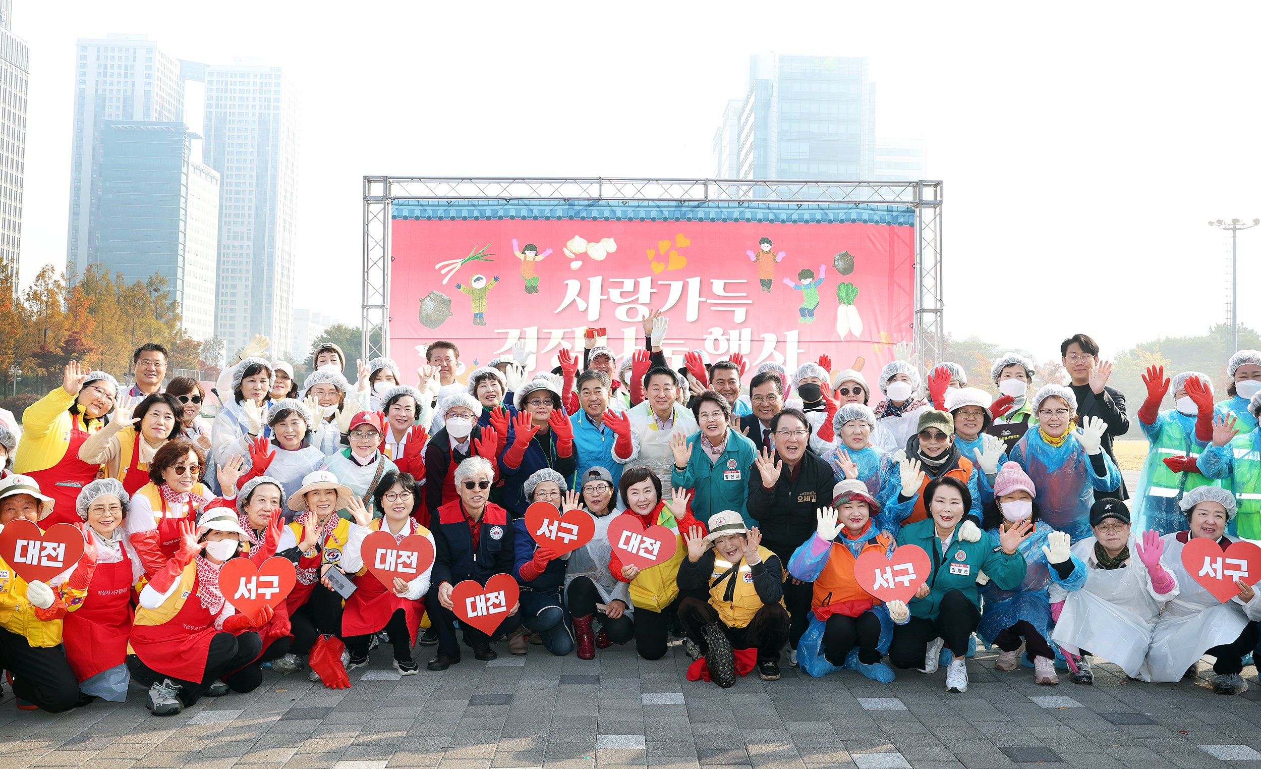 샘머리공원에서_진행된_사랑가득_김장_나눔_행사_현장(사진제공=대전서구) [PEDIEN] 대전 서구에서 소외된 이웃을 위한 따뜻한 김장 나눔 행사가 펼쳐졌다.서구 자원봉사센터는 6일 샘머리공원에서 관내 봉사단체들과 함께 '사랑 가득 김장 나눔'행사를 개최, 훈훈한 온정을 나눴다.올해로 9회째를 맞이한 이번 행사에는 이른 아침부터 500명이 넘는 자원봉사자들이 참여해 구슬땀을 흘렸다.봉사자들은 정성껏 김치를 담가 총 1,400박스를 마련했다.이날 담근 김치는 서구 관내 24개 동의 어려운 이웃들에게 전달되어 따뜻한 겨울을 보낼 수 있도록 도울 예정이다.서구자원봉사센터가 주최한 이번 행사에는 서구자원봉사협의회를 비롯한 다양한 봉사단체들이 참여해 힘을 보탰다.서철모 서구청장은 “자원봉사자들의 따뜻한 손길이 어려운 이웃들에게 큰 힘이 된다”며 감사의 뜻을 전했다.덧붙여 “앞으로도 나눔과 봉사가 넘치는 따뜻한 서구를 만들어가겠다”고 밝혔다. -