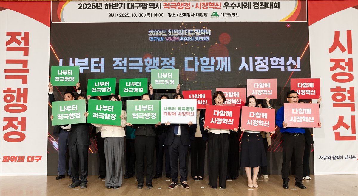 2025 하반기 적극행정 시정혁신 우수사례 경진대회 (대구광역시 제공) [PEDIEN] 대구광역시는 10월 30일 산격청사 대강당에서 ‘2025년 하반기 적극행정·시정혁신 우수사례 경진대회’를 개최하고 총 14건의 우수사례를 선정해 시상했다.이번 경진대회는 대구시와 구·군, 공공기관에서 적극적인 업무 추진으로 시민이 체감할 수 있는 성과를 달성한 우수사례를 발굴·공유하는 자리로 공직 내 적극행정과 혁신 문화 확산을 위해 마련됐다.올해는 1차 서면심사를 통과한 10개의 우수사례에 대해 온라인 시민투표를 실시하고 전문가와 시민평가단의 현장 심사를 거쳐 분야별 최종 순위를 확정했다.그 결과, 적극행정 분야에서는 △‘전국최초! 교동음식물 수거 실명제로 악취도 잡고 시민의 마음도 잡다’, 시정혁신 분야에서는 △‘교통비 반값, 대구·경북 하나로 잇다’가 각각 최우수 사례로 선정됐다.적극행정 분야 최우수 사례는 음식물 수거 용기에 업소의 간판 이미지를 활용한 실명제 스티커를 부착해 관리함으로써, 시민들의 보행 불편과 악취 문제를 동시에 개선한 점이 높이 평가받았다.시정혁신 분야 최우수 사례는 대경선 개통을 계기로 대구·경북 9개 지자체와 13개 운송기관, 민간 요금 정산사가 협력해 환승 통합요금제를 구축·추진한 결과, 시행 6개월 만에 통행량 11만 건 증가, 환승 건수 10% 이상 증가 등 가시적인 성과를 거둔 점이 주목받았다.이 외에도 적극행정 분야 우수사례로 △‘지금 주차 가능한 곳 어디? 실시간 스마트폰으로 확인하세요’ △‘17년간 방치된 도심 폐기물처리장, 첨단 이차전지 재활용 산업단지로 재탄생’, 시정혁신 분야 우수사례로 △‘AI기반 신호케이블 변경 자동감지시스템 개발로 스마트 점검체계 구축’ △‘AI기반 맞춤형 고독사 예방관리 - 365일 24시간 안심올케어’’가 선정됐다.수상기관에는 시장상과 시상금이 수여되며 수상자에게는 성과상여금 최고 등급 등 특별 인사 인센티브가 부여된다.김정기 대구광역시장 권한대행 행정부시장은 “이번 대회를 통해 우수한 사례들이 시정 전반에 널리 확산돼 시민들이 체감할 수 있는 변화를 만들어가길 기대한다”며 “앞으로도 공직 내 적극행정과 시정혁신 문화를 확산하기 위해 최선을 다하겠다”고 말했다. -