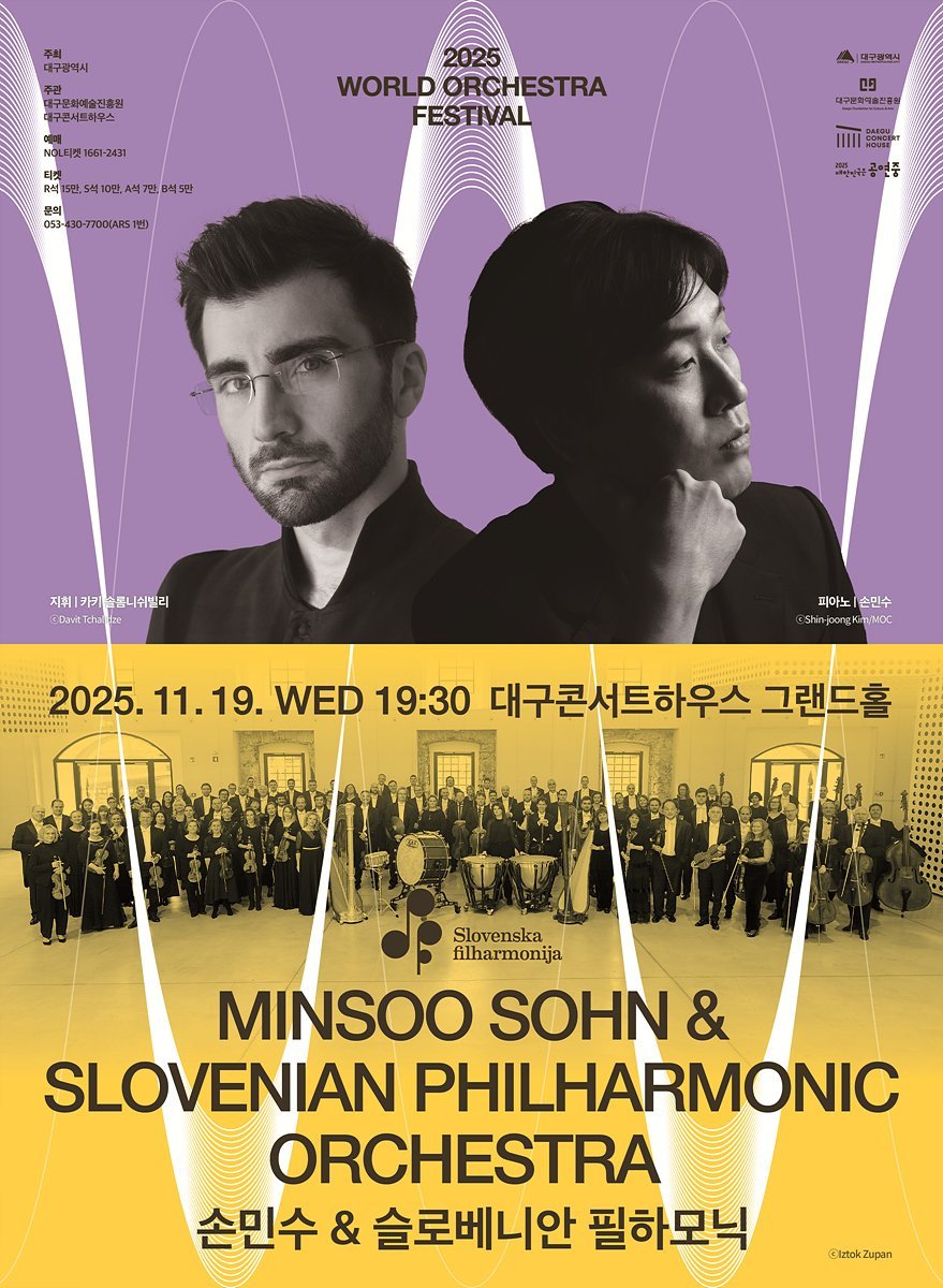 손민수 슬로베니안 필하모닉 포스터 (대구광역시 제공) [PEDIEN] 유럽의 대표적인 오케스트라인 슬로베니안 필하모닉이 피아니스트 손민수와 함께 대구콘서트하우스 무대에 오른다.11월 19일 '월드오케스트라페스티벌'의 일환으로 열리는 이번 공연은 슬로베니안 필하모닉의 역사적인 첫 내한 공연이다.이번 공연에서는 한국인이 사랑하는 라흐마니노프 피아노 협주곡 2번을 손민수의 협연으로 감상할 수 있다.슬로베니안 필하모닉은 1701년 설립된 아카데미아 필하모니코룸을 전신으로 하는 유서 깊은 악단이다.1947년부터 현재의 명칭을 사용하며 324년의 역사 동안 수많은 거장 지휘자들을 배출했다.카를로스 클라이버, 리카르도 무티, 샤를 뒤투아 등이 슬로베니안 필하모닉을 거쳐갔다.슬로베니아 출신 연주자들과 해외 연주자들이 조화를 이루며 유럽의 대표 악단으로 자리매김했다는 평가를 받는다.이번 내한 공연에서는 2024년부터 악단을 이끌고 있는 젊은 지휘자 카키 솔롬니쉬빌리가 지휘봉을 잡는다.샤를 뒤투아의 조수로 활동하며 국제적인 경력을 쌓은 그는 슬로베니안 필하모닉과의 협력을 통해 수석 지휘자로 임명됐다.협연자로 나서는 피아니스트 손민수는 섬세함과 통찰력 있는 음악성, 뛰어난 기교를 겸비한 연주자로 알려져 있다.대구에서 음악적 기반을 다진 그는 솔라시안 유스 오케스트라와의 협연 등 대구 관객과 꾸준히 소통해왔다.2006년 호넨스 국제 콩쿠르에서 한국인 최초로 우승하며 국제적인 주목을 받은 손민수는 현재 뉴잉글랜드 음악원 교수로 재직하며 후학 양성에도 힘쓰고 있다.특히 반 클라이번 콩쿠르 우승자인 임윤찬의 스승으로도 유명하다.이번 공연은 조르주 미체우즈의 오페라 'The Fairy Child'서곡으로 시작한다.이어 손민수가 라흐마니노프 피아노 협주곡 2번을 연주하며 마지막으로 브람스 교향곡 1번이 연주될 예정이다.공연 당일 오후 6시 30분에는 대구콘서트하우스 뮤직카페에서 정은주 작가의 해설 프로그램 '비포 더 콘서트'가 진행된다.공연은 초등학생 이상 관람 가능하며 티켓은 대구콘서트하우스 웹사이트 또는 전화로 예매할 수 있다. -