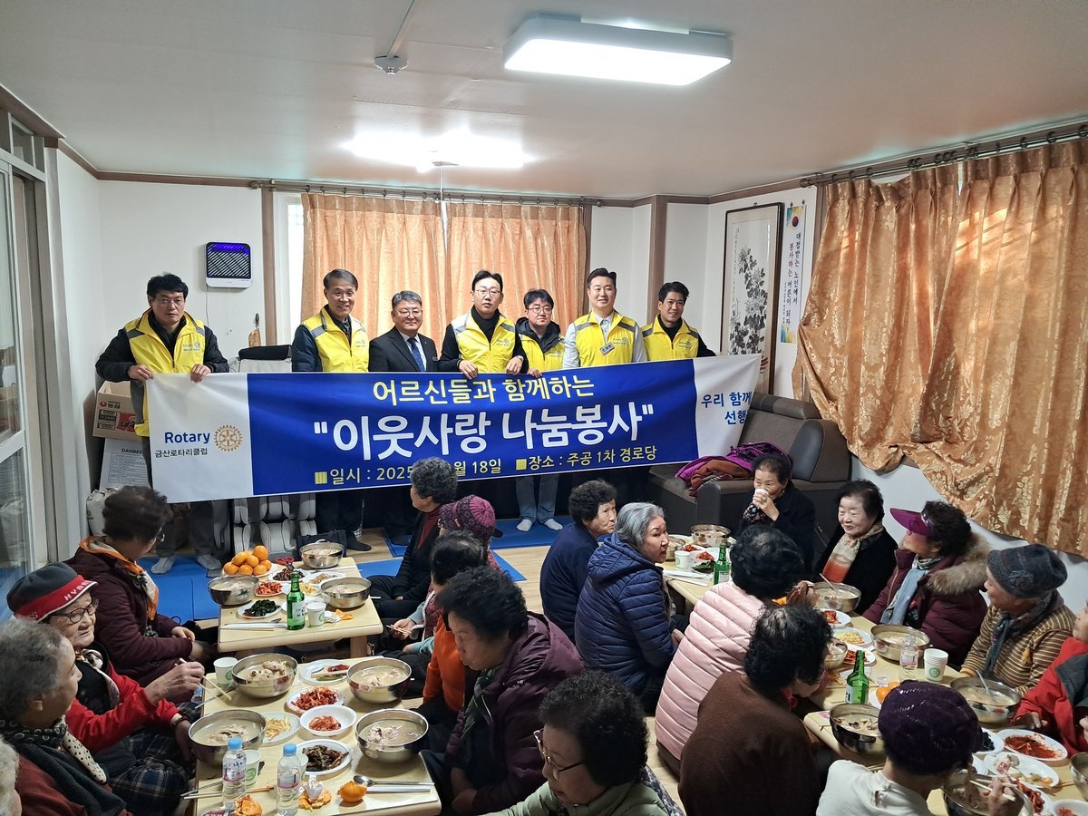 금산로타리클럽 금산읍경로당 어르신 위한 따뜻한 점심 봉사 (금산군 제공) [PEDIEN] 금산로타리클럽이 지난 18일 금산읍 상9리 주공아파트 경로당에서 지역 어르신들을 위한 따뜻한 점심 식사 봉사활동을 펼쳤다.이번 봉사활동은 금산로타리클럽 회원 12명이 직접 정성껏 준비한 삼계탕과 과일 등의 풍성한 메뉴로 구성됐다. 어르신들의 건강을 기원하며 따뜻한 식사를 대접하고, 말벗이 되어 드리는 시간을 가졌다.김진만 금산로타리클럽 회장은 “지역 어르신들에게 작은 정성이지만 따뜻한 마음을 전하고 싶어 이번 봉사를 마련했다”고 밝혔다. 이어 “앞으로도 지역사회와 함께하는 다양한 나눔 활동을 지속적으로 이어갈 것”이라고 덧붙였다.이기영 금산읍장은 “뜻깊은 봉사를 해주신 금산로타리클럽에 진심으로 감사드린다”며 감사의 뜻을 전했다. 또한 “앞으로도 지역 어르신들을 위한 나눔 활동을 계속 이어가 주길 바란다”고 말했다.한편 금산로타리클럽은 취약계층 지원, 환경정화 활동, 장학사업 등 다양한 봉사활동을 통해 지역사회 발전과 이웃사랑을 꾸준히 실천하고 있다. -