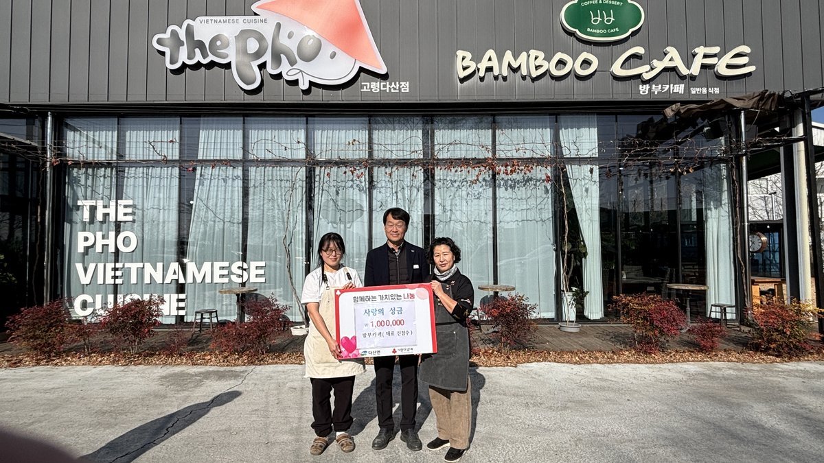 다산면 밤부카페 사랑의 성금 100만원 기탁 (고령군 제공) [PEDIEN] 다산면 좌학리에 위치한 밤부카페가 지난 18일, 「희망2026 나눔캠페인」에 사랑의 성금 100만원을 기탁하며 따뜻한 나눔을 실천했다.밤부카페는 어려운 경제 상황 속에서 생활고에 지친 이웃들에게 작은 도움이라도 되고자 성금을 기탁하게 되었다고 밝혔다. 용기를 잃지 않고 희망을 가지고 살아갈 수 있도록 힘을 보태고 싶다는 따뜻한 마음을 전했다.윤종백 다산면장은 밤부카페의 나눔 실천에 감사를 표하며, 겨울철 더욱 어려움을 겪는 복지 사각지대 이웃들에게 따뜻한 마음을 잘 전달하겠다고 약속했다. 밤부카페의 성금은 다산면 내 어려운 이웃들에게 희망을 전달하는 데 사용될 예정이다. -