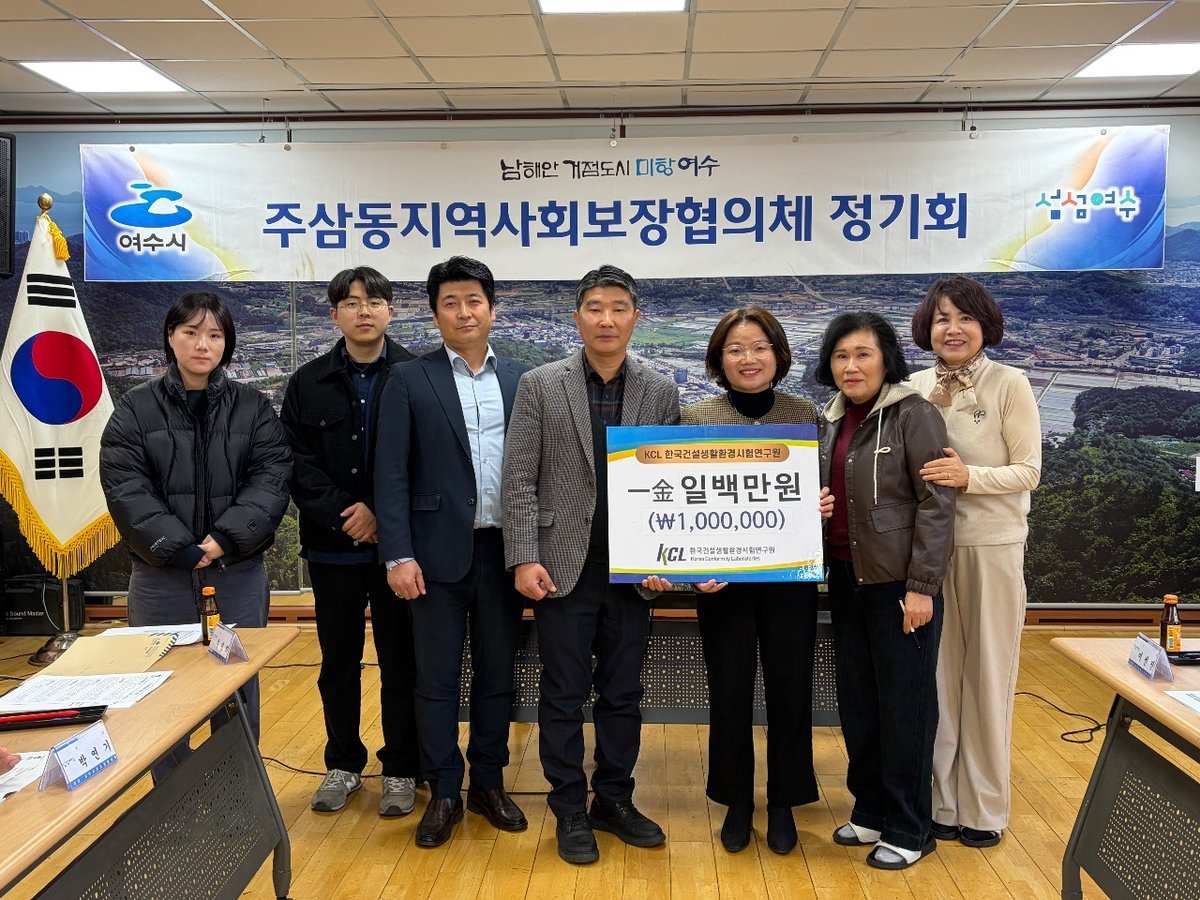 한국건설생활환경시험연구원, 주삼동에 후원금 기탁 (여수시 제공) [PEDIEN] 한국건설생활환경시험연구원이 지난 17일 여수시 주삼동의 어려운 이웃들을 위해 100만원의 후원금을 전달했다.KCL은 에너지, 생활안전, 화학 등 다양한 산업 분야에서 시험·검사·인증 서비스를 제공하는 기관이다. 4년째 꾸준히 나눔을 실천하며 사회공헌 활동을 이어오고 있다.이번 후원금 전달식에는 KCL 호남내진본부 전남CCU센터 하헌재 센터장과 직원들이 참석했다. 하헌재 센터장은 직원들과 함께 기부할 수 있어 뜻깊게 생각하며, 앞으로도 지속적인 나눔 활동을 통해 지역사회와 함께하는 기관이 되겠다고 밝혔다.주삼동은 기탁받은 성금을 내년도 지역사회보장협의체 연합모금 복지사업에 사용할 계획이다. 김순희 주삼동장은 KCL의 따뜻한 나눔에 감사를 표하며, 후원금을 지역 내 어려운 이웃을 위해 소중하게 사용하겠다고 전했다.KCL의 꾸준한 후원은 지역사회에 따뜻한 온정을 전하고 있다. 앞으로도 KCL은 사회적 책임을 다하며 지역사회와 함께 성장하는 데 기여할 것으로 기대된다. -