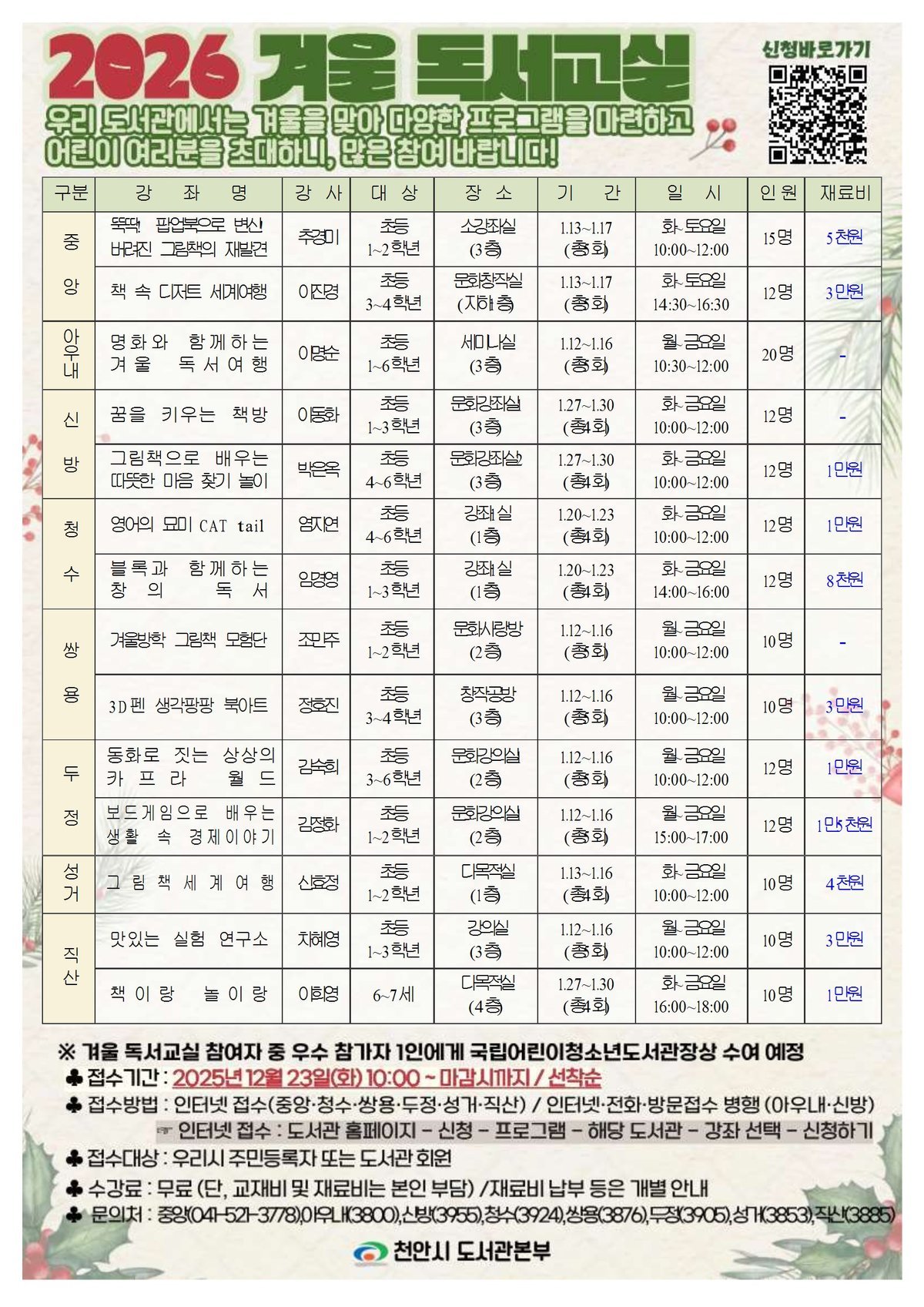 쌍용도서관 겨울 독서교실 운영 홍보문 [PEDIEN] 천안시는 내년 1월 12~ 30일 어린이와 함께하는 ‘겨울 독서교실’을 운영한다고 19일 밝혔다.겨울 독서교실은 천안시 8개 공공도서관에서 운영되며, 독서활동과 함께 요리체험, 창작활동 등 다양한 프로그램이 진행될 예정이다.신청은 오는 23일 오전 10시부터 천안시도서관 누리집에서 선착순으로 진행된다. 도서관별 운영프로그램은 천안시도서관 누리집에서 확인할 수 있다.쌍용도서관 관계자는 “어린이들이 겨울방학을 맞아 책과 친해지고, 도서관에서 다양한 경험을 통해 성장할 수 있기를 기대한다”고 말했다. -