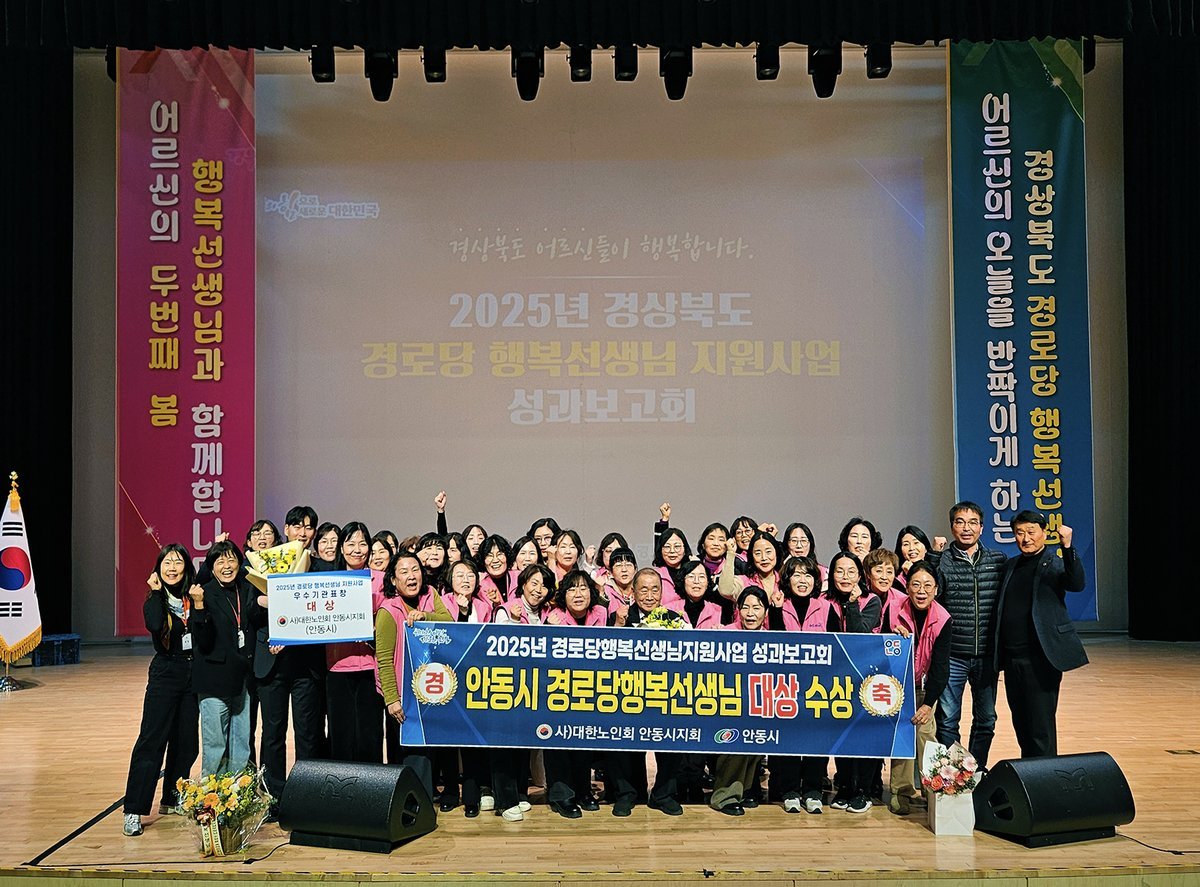 안동시․대한노인회 안동시지회, 경로당 행복선생님 지원사업 ‘대상’수상 (안동시 제공) [PEDIEN] 안동시와 대한노인회 안동시지회는 12월 18일, 경상북도가 경북도청 동락관에서 개최한 ‘경로당 행복선생님 지원사업 2025년도 성과보고회’에서, 도내 22개 수행기관을 대상으로 한 사업평가 결과 ‘대상’을 수상하는 영예를 안았다.이번 성과보고회는 시군별 우수사례 발표와 어르신 작품 전시를 통해 사업 성과를 공유하는 자리로 마련됐으며, 평가는 5개 분야의 평가지표를 기준으로 종합적으로 이뤄졌다.안동시는 경로당 행복선생님이 운영한 △‘실종 예방 팔찌 제작 프로그램’을 통해 치매 어르신의 실종 예방은 물론 숫자놀이를 활용한 인지능력 향상과 소통 기회를 제공한 점, △‘특별재난지역 어르신 안부 확인 서비스 프로그램’을 통해 재난 상황 속 어르신들의 심리 안정과 안전 확보에 기여한 점에서 높은 평가를 받았다.‘경로당 행복선생님 지원사업’은 2019년 시범사업으로 시작돼 현재 34명의 행복선생님이 주 1회 안동시 관내 경로당 553개소를 방문하며 운영되고 있다.행복선생님들은 △프로그램 코디네이터 △복지 코디네이터 △경로당 코디네이터 역할을 수행하며 어르신들의 일상을 밀착 지원하고 있다.앞서 제32회 방재의날 기념식에서도 경로당 이용 어르신의 심리 안정과 안전 확보에 기여한 공로를 인정받아, 경로당 행복선생님이 행정안전부장관상을 수상한 바 있다.안동시 관계자는 “경로당 행복선생님 지원사업은 건강․여가․교육․복지를 아우르는 경북형 경로당 운영지원 모델”이라며, “경로당 어르신들이 행복선생님을 손꼽아 기다린다는 이야기를 들으면 큰 보람을 느낀다. 어르신 복지를 위해 한 해 동안 헌신해 주신 행복선생님들께 깊이 감사드린다”고 전했다. -