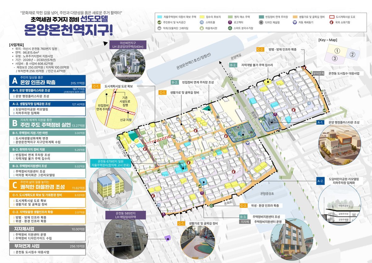 아산시, ‘온양2동 온양온천역지구’노후주거지정비 지원사업 선정 (아산시 제공) [PEDIEN] 아산시 온양2동 온양온천역 지구가 국토교통부의 노후주거지정비 지원사업 대상지로 선정되며, 대대적인 변화를 예고했다.이번 선정으로 아산시는 국비 150억 원을 포함, 총 606억 원의 사업비를 확보하여 온양온천역 일대의 주거 환경 개선에 나선다.노후주거지정비 지원사업은 전면 재개발이 어려운 구도심의 주거 환경을 개선하고, 주민들의 생활 편의를 증진하는 데 목적을 둔다.아산시는 이번 사업을 통해 온양 행정플러스타운 조성, 공영주차장 및 입체공원 조성, 주택정비 지원 기반 마련 등 다양한 사업을 추진할 계획이다.특히, 온양온천역 일대의 노후 주택 정비와 생활 인프라 확충을 통해 주민들에게 보다 안전하고 편리한 정주 환경을 제공하는 데 초점을 맞출 예정이다.이번 사업은 2026년부터 2030년까지 5년간 단계적으로 진행되며, 아산시는 역세권을 중심으로 주거와 생활 환경 전반을 체계적으로 개선해 나갈 방침이다.아산시 관계자는 이번 사업 선정에 대해 지역 주민들의 적극적인 참여와 협조 덕분이라며, 노후주거지정비 지원사업을 통해 온양2동 주민들의 삶의 질을 향상시키겠다고 밝혔다.또한, 노후 주택 정비와 생활 인프라 현대화를 통해 더욱 안전하고 편리한 정주 환경을 조성해 나갈 것이라고 덧붙였다. -