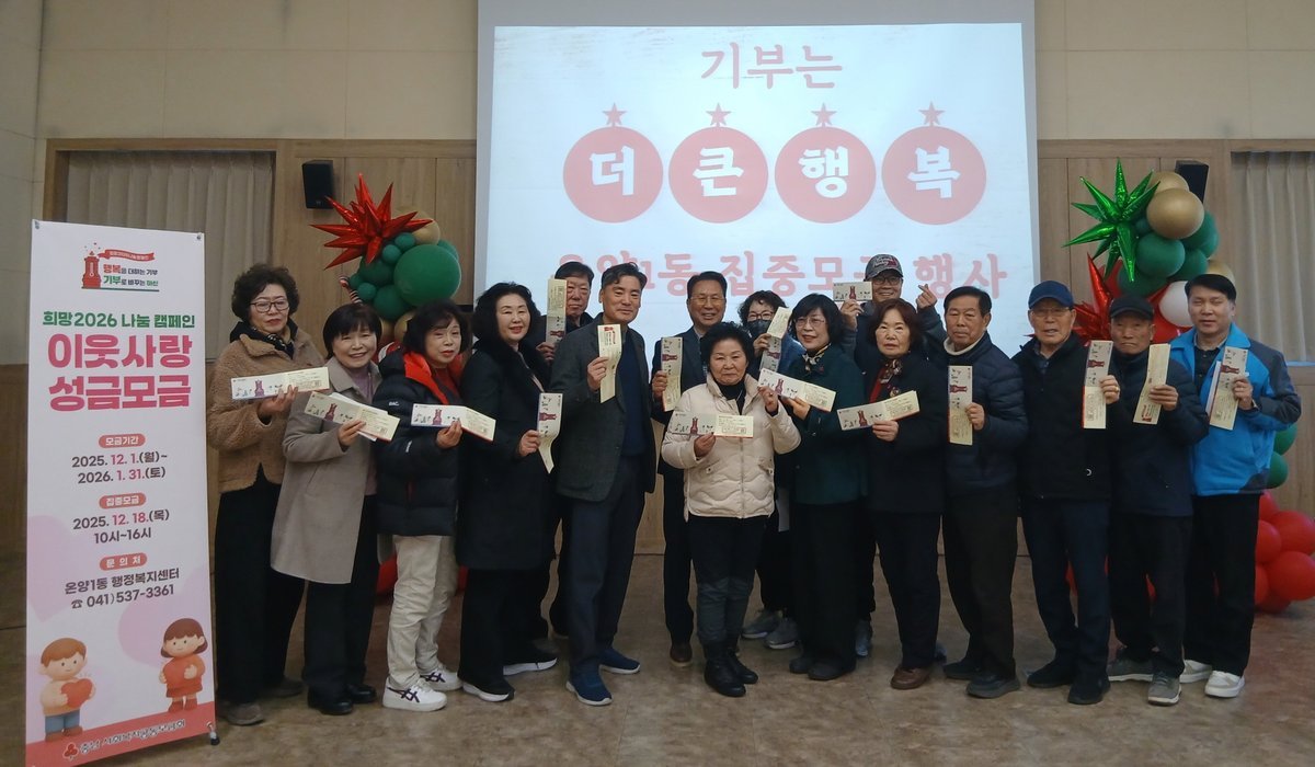 아산시 온양1동, ‘희망2026 나눔캠페인’집중모금... 온양온천처럼 뜨거운 나눔 열기 (아산시 제공) [PEDIEN] 아산시 온양1동에서 희망2026 나눔 캠페인이 따뜻한 나눔의 열기로 가득 찼다.온양1동은 지난 18일 행정복지센터에서 집중 모금 행사를 열고, 통장협의회를 비롯한 기관, 단체, 그리고 주민들의 자발적인 참여를 통해 520만 원의 성금을 모금했다고 밝혔다.이번 캠페인은 연말연시를 맞아 주변의 어려운 이웃들에게 따뜻한 마음을 전달하고, 지역 사회에 나눔 문화를 확산시키기 위해 마련되었다. 온양1동 통장협의회, 새마을남녀협의회, 주민자치회 등 여러 기관과 단체, 그리고 주민들이 십시일반 정성을 모아 그 의미를 더했다.장일권 온양1동 통장협의회장은 주민과 단체가 함께 나눔에 동참할 수 있어서 기쁘다고 전하며, 온양온천의 뜨거운 열기처럼 따뜻한 마음이 어려운 이웃들에게 잘 전달되기를 바란다고 말했다.심현성 온양1동장은 어려운 상황 속에서도 나눔에 참여해 준 기관, 단체, 그리고 주민들에게 깊은 감사를 표했다. 또한 전달된 성금은 도움이 필요한 이웃들에게 소중하게 사용되어 따뜻한 온양1동을 만들어가는 데 기여할 것이라고 밝혔다.한편, 온양1동 행정복지센터는 이달 초 모금을 시작한 이후 지역 사회 각계각층의 참여가 계속 이어지면서 훈훈한 나눔 분위기가 확산되고 있다고 전했다. -