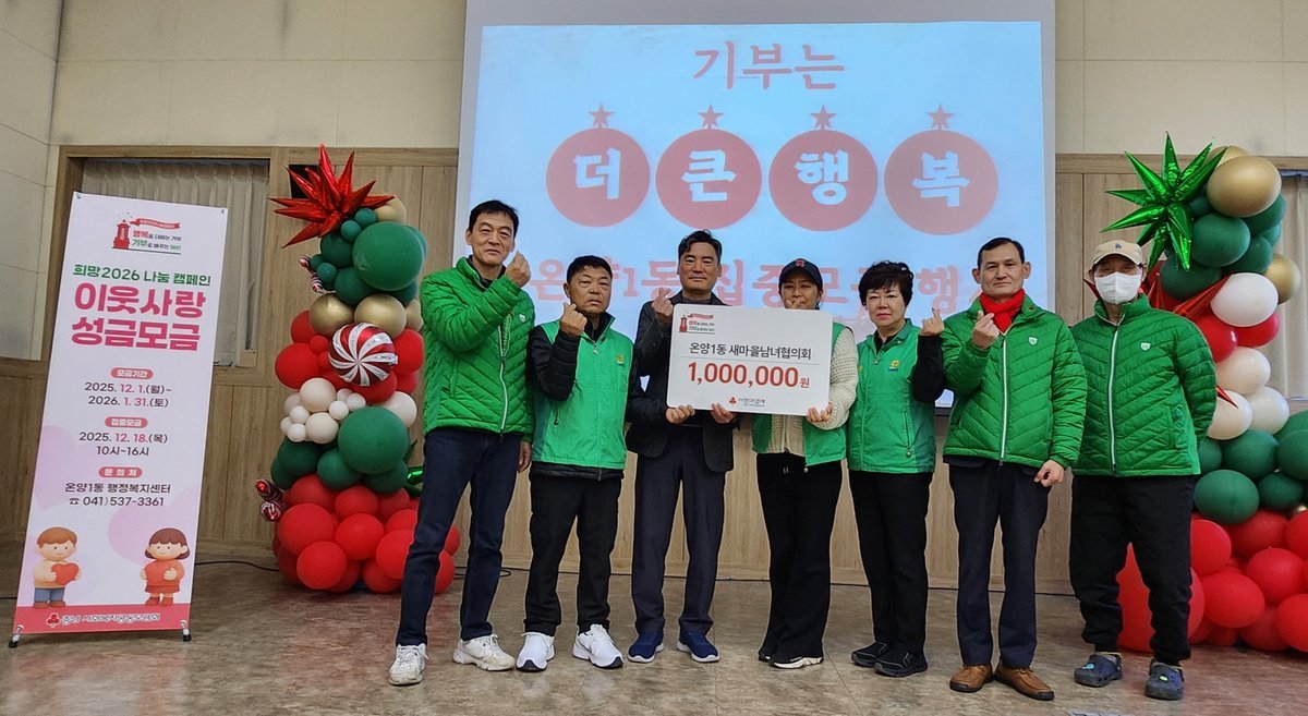 아산시 온양1동 새마을협의회, ‘희망2026 나눔캠페인’성금 100만 원 기부 (아산시 제공) [PEDIEN] 아산시 온양1동 새마을남녀협의회는 18일 열린 온양1동 ‘희망2026 나눔캠페인 집중모금 행사’에 참여해 성금 100만 원을 기부하며 이웃사랑을 실천했다.이번 성금은 연말연시를 맞아 지역 내 어려운 이웃을 돕고 나눔 문화를 확산하기 위해 새마을남녀협의회 회원들이 정성을 모아 마련했으며, 충남사회복지공동모금회를 통해 저소득층 및 복지 사각지대 가구의 생계·의료 지원 등에 사용될 예정이다.박상철 회장과 손미섭 부녀회장은 “작은 정성이지만 어려운 이웃들에게 희망과 용기가 되길 바란다”며 “앞으로도 지속적인 봉사와 나눔 활동을 통해 이웃사랑 실천에 앞장서겠다”고 말했다.심현성 온양1동장은 “매년 꾸준히 나눔을 실천해 주시는 새마을협의회에 깊이 감사드린다”며 “기탁된 성금은 꼭 필요한 이웃들에게 소중히 전달하겠다”고 전했다.한편, 온양1동 새마을협의회는 환경정화 활동, 밑반찬 나눔, 김장 나누기 등 다양한 봉사활동을 통해 지역사회 나눔 문화 확산에 기여하고 있다. -