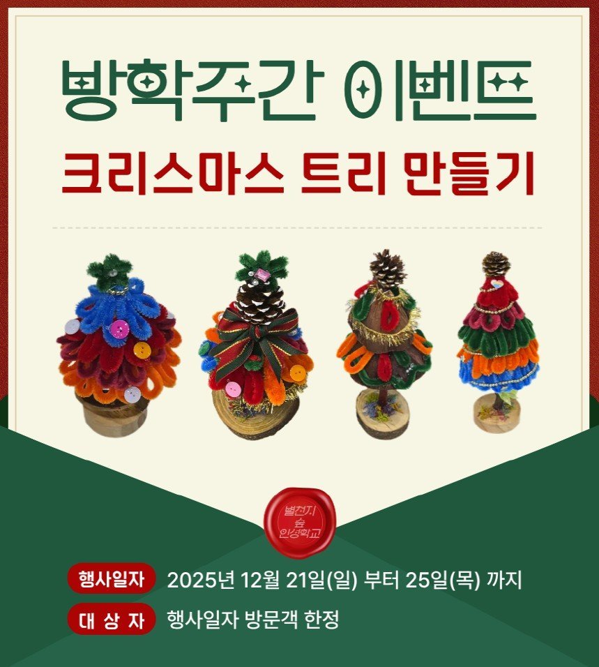 증평 별천지숲인성학교, 겨울숲에서 키우는 상상력...자연물로 채운 방학 수업 (증평군 제공) [PEDIEN] 증평군 별천지숲인성학교가 겨울방학을 맞이하여 아이들이 자연 속에서 상상력을 키울 수 있는 특별한 체험 프로그램을 운영한다.이번 프로그램은 숲 교육을 기반으로 자연물을 활용한 만들기 체험으로 구성되어, 아이들이 자연과 교감하며 창의력과 감성을 키울 수 있도록 기획되었다.오는 12월 21일부터 내년 2월 28일까지 진행되는 이번 프로그램은, 아이들이 인위적인 교구 대신 숲에서 얻을 수 있는 다양한 재료를 활용하여 스스로 상상력을 펼칠 수 있도록 돕는 것이 특징이다.프로그램의 시작을 알리는 첫 번째 활동은 12월 21일부터 25일까지 진행되는 크리스마스트리 만들기 체험이다. 아이들은 연밥, 솔방울, 색실 등 자연 재료를 활용하여 자신만의 개성이 담긴 트리를 만들게 된다.이 과정에서 아이들은 재료를 관찰하고 만지면서 감각을 발달시키고, 지도사와 함께 트리를 꾸미며 협력과 배려의 가치를 배우게 된다.12월 26일부터 내년 2월 28일까지는 숲 산책을 통해 직접 모은 나뭇잎, 솔방울, 마른 꽃 등을 활용하여 자연물 액자를 만드는 활동이 진행된다.아이들은 재료의 크기, 색깔, 질감을 탐색하며 액자의 구성을 고민하고, 손으로 직접 작품을 완성해 나가는 과정을 통해 관찰력, 집중력, 창의적 사고를 키울 수 있다.아이들이 만든 크리스마스트리와 자연물 액자는 별천지숲인성학교 내부에 전시되어 겨울방학 동안 아이들과 학부모가 함께 감상할 수 있는 기회를 제공한다.별천지숲인성학교 관계자는 “이번 프로그램은 아이들이 겨울 숲에서 자연을 온전히 느끼고 즐기며, 상상력과 따뜻한 마음을 키울 수 있도록 준비했다”고 밝혔다.또한 “아이들의 작품 하나하나에는 아이들의 순수한 마음과 창의적인 아이디어가 담겨 있어, 아이들뿐만 아니라 부모님들에게도 의미 있는 시간이 될 것이다”라고 전했다. -