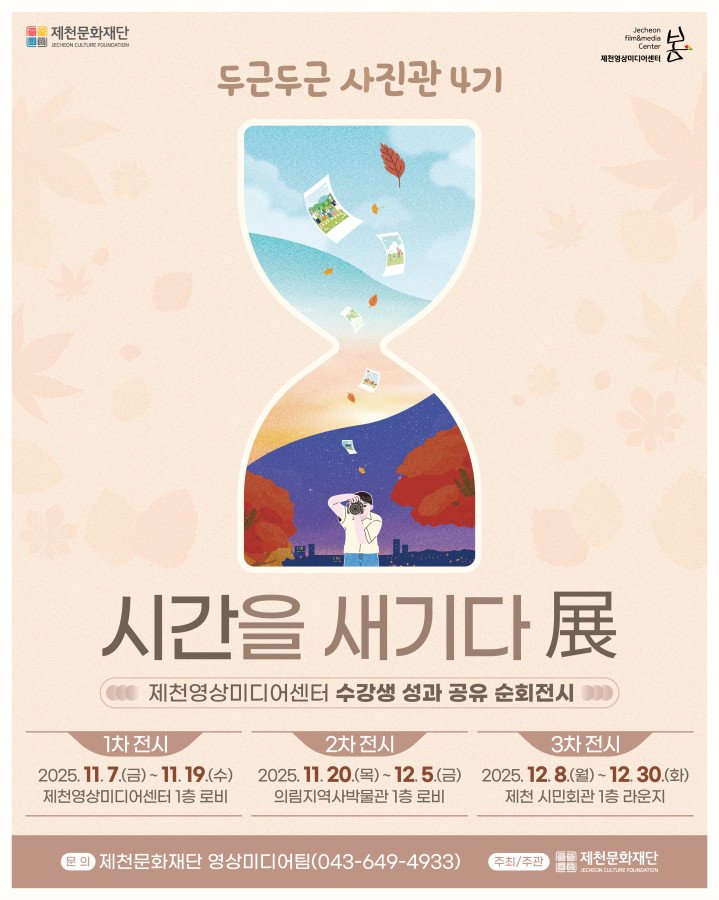 제천문화재단 두근두근 사진관 4기 시간을 새기다 전시 개최 (제천시 제공) [PEDIEN] 제천문화재단이 주최하는 '두근두근 사진관 4기 : 시간을 새기다 展'이 11월 7일부터 12월 30일까지 제천시 일원에서 열린다.이번 전시는 제천영상미디어센터 교육 프로그램 수강생들이 참여하여, 사진과 웹툰으로 제천의 다양한 모습을 담아낸 작품들을 선보인다. 올해로 4회째를 맞이하는 '두근두근 사진관'은 시민들과 함께 미디어 교육의 성과를 공유하는 의미있는 자리다.전시에서는 사진 촬영 기초반 수강생들의 작품 16점, 소외지역 어르신들의 미디어 교육 작품 2점, 그리고 AI 웹툰 교육 수강생들의 작품 6점 등 총 24점의 다채로운 작품을 만나볼 수 있다.개막 행사는 11월 7일 오후 7시 제천영상미디어센터에서 개최되며, 이후 의림지역사박물관과 제천시민회관에서 순회 전시가 진행될 예정이다. 시민들은 제천 곳곳에서 수강생들의 개성 넘치는 작품들을 감상할 수 있다.제천문화재단은 이번 전시를 통해 시민들이 미디어를 통해 세상을 바라보는 새로운 시각을 경험하고, 지역 문화 예술에 대한 관심을 높이는 계기가 되기를 기대한다고 밝혔다.전시 관련 자세한 사항은 제천문화재단 영상미디어팀 또는 센터 누리집을 통해 확인할 수 있다. -
