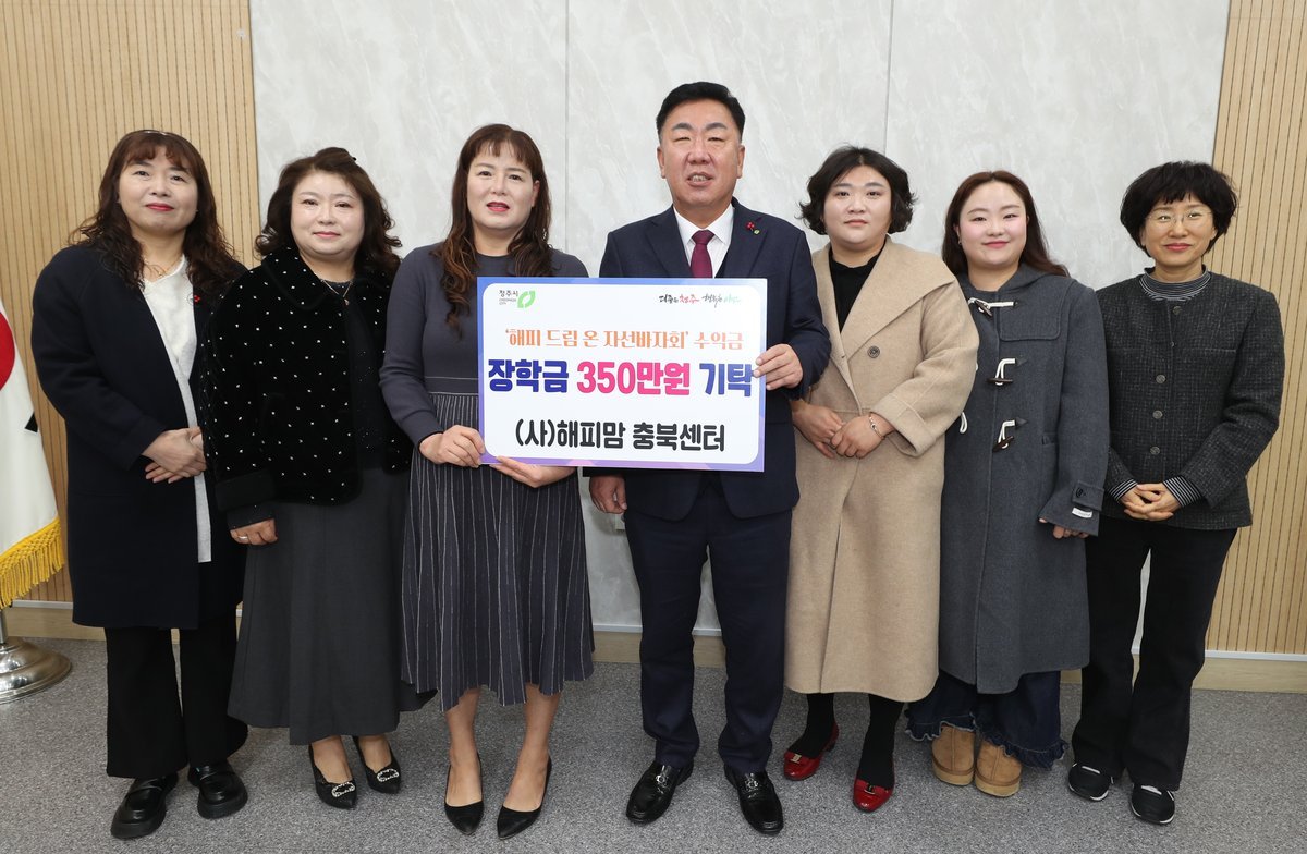 해피맘 충북센터, 청주시에 장학금 350만원 기탁 (청주시 제공) [PEDIEN] 해피맘 충북센터가 어려운 환경 속에서도 학업에 열중하는 청주 지역 학생들을 위해 350만원의 장학금을 청주시에 기탁했다.이번 장학금은 해피맘 충북센터 회원들이 지난 11월 개최한 '해피 드림 온 자선바자회'의 수익금으로 마련되어 그 의미를 더했다.장학금 전달식은 청주시 임시청사 직지실에서 이범석 청주시장과 남현순 해피맘 충북센터 센터장이 참석한 가운데 진행됐다.장학금은 경제적인 어려움 속에서도 성실하게 학업에 매진하는 초·중·고등학생 7명에게 전달될 예정이다.남현순 센터장은 회원들의 노력으로 마련된 바자회 수익금을 뜻깊은 곳에 사용할 수 있어 기쁘다는 소감을 밝혔다. 앞으로도 회원들과 함께 지속적인 봉사활동을 이어갈 것을 약속했다.이범석 시장은 해피맘 충북센터 회원들에게 감사의 인사를 전하며, 장학금이 학생들의 학업 정진에 도움이 될 수 있도록 소중히 전달하겠다고 답했다.170여 명의 회원으로 구성된 해피맘 충북센터는 한부모 가정 지원, 사회봉사, 기부 등 다양한 사회공헌 활동을 꾸준히 실천하고 있다. 지난해에도 바자회 수익금 450만원을 장학금으로 기탁하며 지역사회에 따뜻한 온정을 전한 바 있다. -