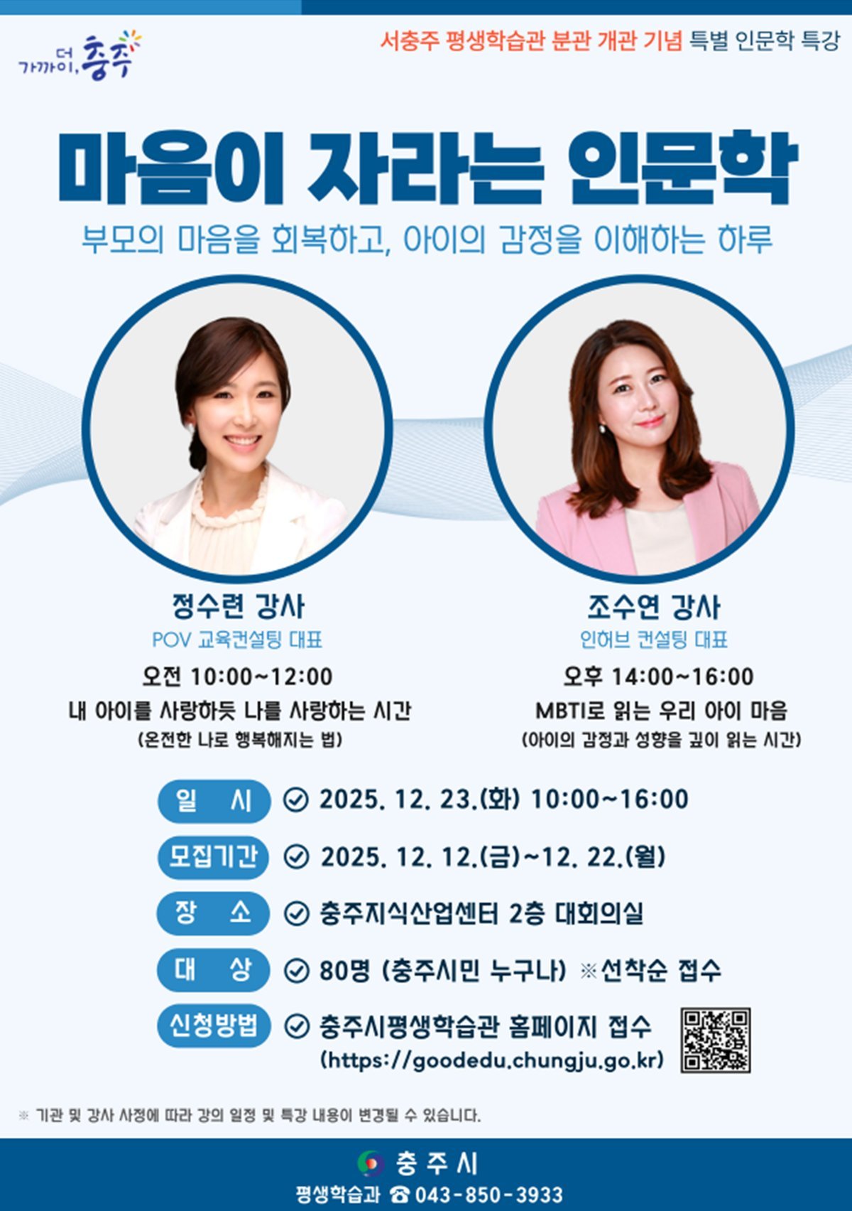 서충주 평생학습관 분관 개관 기념, 특별 인문학 특강 개최 (충주시 제공) [PEDIEN] 충주시가 서충주 평생학습관 분관 개관을 기념하여 특별 인문학 특강 '마음이 자라는 인문학'을 개최한다.이번 특강은 12월 23일 충주지식산업센터에서 진행되며, 서충주 주민과 기업체 직원들의 평생학습 접근성을 높이기 위해 마련됐다.특강은 부모와 아이가 함께 성장할 수 있는 가족 중심 프로그램으로 기획되어 시민들의 많은 관심이 예상된다.강의는 오전 10시부터 오후 4시까지 충주지식산업센터 2층 대회의실에서 진행된다. 오전에는 정수련 강사가 '내 아이를 사랑하듯 나를 사랑하는 시간'이라는 주제로 부모의 감정 이해와 자기 돌봄의 중요성을 강조한다.오후에는 조수연 강사가 'MBTI로 읽는 우리 아이 마음'이라는 주제로 성격유형을 활용한 자녀 이해 방법을 소개할 예정이다.충주시민 누구나 참여 가능하며, 오전·오후 강의 각각 선착순 80명을 12월 22일까지 모집한다. 신청은 충주시 평생학습관 홈페이지를 통해 가능하다.충주시는 이번 특강을 통해 서충주 주민들의 삶의 질을 향상시키고, 평생학습 기회를 확대할 계획이다. 앞으로도 다양한 평생학습 프로그램을 통해 지역 주민들의 정주 여건을 개선하는 데 힘쓸 것이라고 밝혔다. -