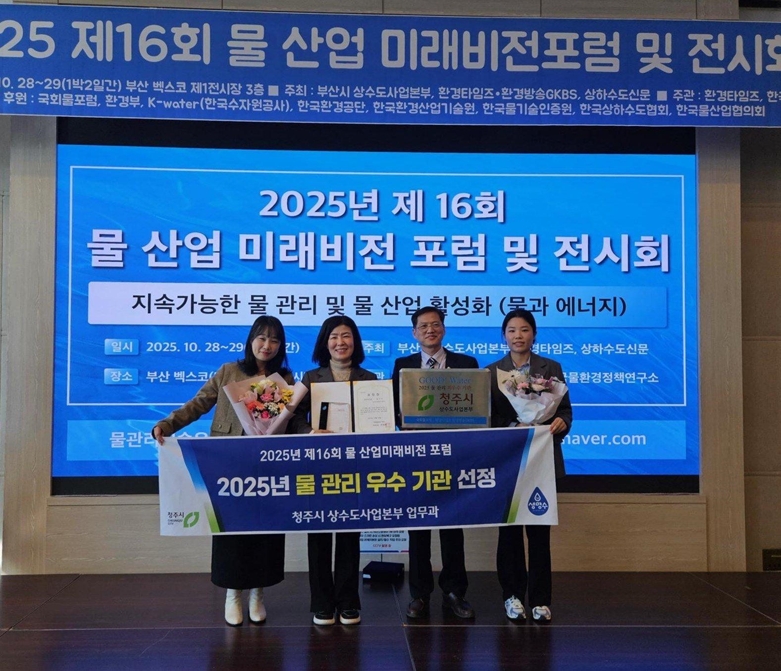 청주시 상수도사업본부, ‘물관리 우수기관’ 선정(사진제공=청주시) [PEDIEN] 청주시 상수도사업본부가 '제16회 물 산업미래 비전 포럼'에서 물 관리 우수기관으로 선정되는 영예를 안았다.이번 수상은 청주시가 지속가능한 물 관리 체계 구축을 위해 노력한 결과로 풀이된다. 물 산업미래 비전 포럼은 물 산업 전략 마련을 위한 협력의 장으로, 매년 민·관·학이 참여하여 물 산업 육성과 저탄소 녹색성장을 모색한다.청주시 상수도사업본부는 2025년 공기업평가에서 '우수' 등급을 획득하고, ISO 45001 안전보건경영시스템 갱신 심사에서 적합 판정을 받는 등 꾸준한 노력을 기울여왔다. 또한 수도요금 전자고지 활성화, 물사랑 서포터즈 운영, 정수장 견학 프로그램 운영, 수돗물 품질 보고서 발간 등 시민과의 소통을 강화하며 신뢰받는 상수도 행정을 구현하고 있다.박관석 상수도사업본부장은 시민들에게 안전한 수돗물을 공급하기 위한 노력의 결실이라며, 앞으로도 지속가능한 물 관리 체계를 강화하고 깨끗한 물 공급 환경을 조성하는 데 최선을 다하겠다고 밝혔다.한편 이번 포럼은 환경부, 한국환경공단 등 여러 기관의 후원 아래 환경타임즈와 환경방송GKBS 주최로 진행되었다. -