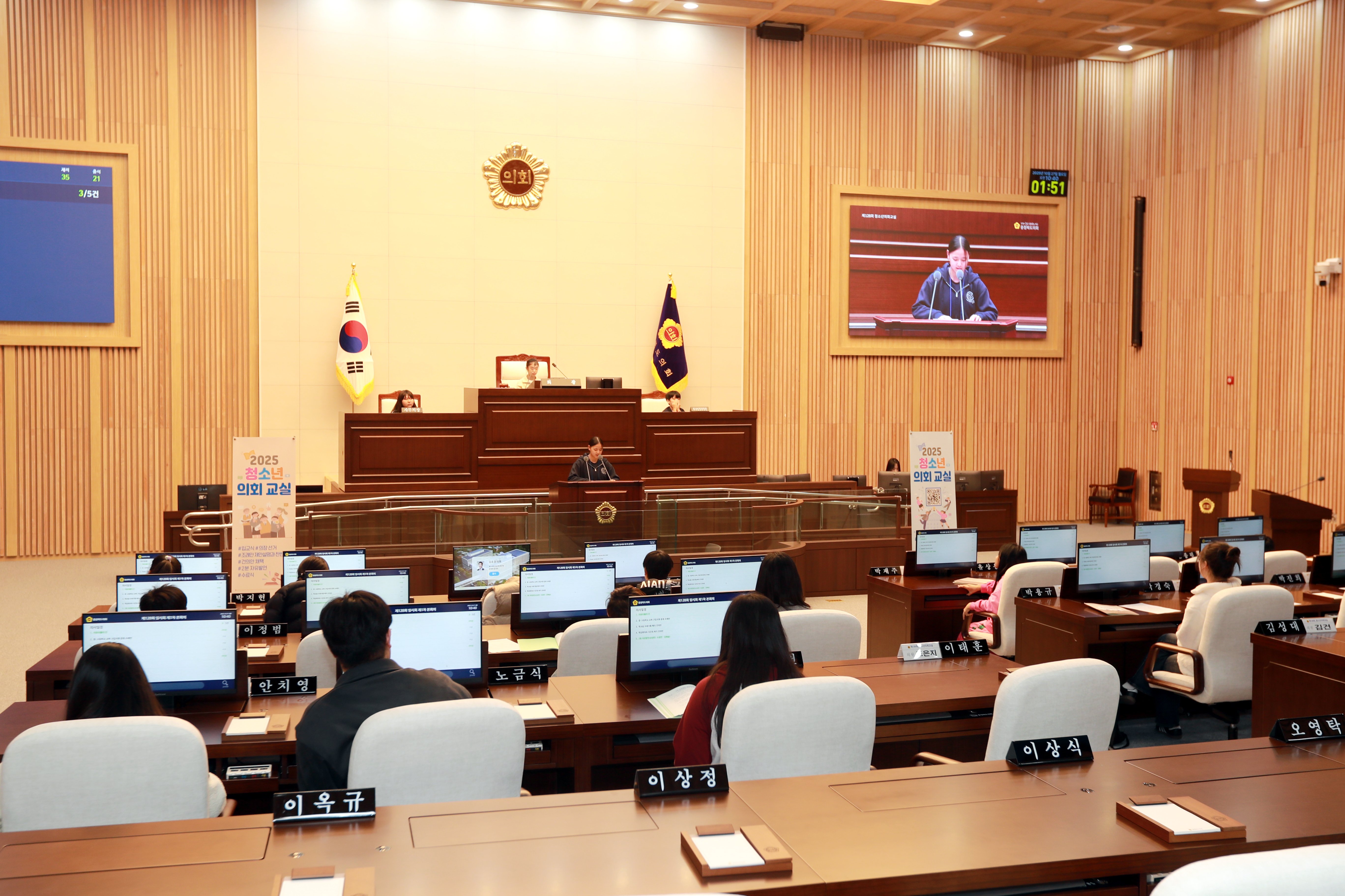 제128회 청소년 의회교실(충주시 초중고학생회장단) (충청북도 제공) [PEDIEN] 충주 지역 초·중·고등학생 회장단이 충북도의회에서 특별한 하루를 보냈다. 이들은 1일 도의원이 되어 지방의회의 역할을 직접 체험하고, 정책 결정 과정에 참여하는 소중한 경험을 쌓았다.충북도의회는 27일 본회의장에서 '청소년 의회교실'을 열고, 충주 지역 학생 25명에게 의정활동 체험 기회를 제공했다. 학생들은 의장 선거, 안건 처리, 자유발언 등 실제 도의원들이 수행하는 활동을 그대로 따라 하며 민주적인 의사결정 과정을 몸소 익혔다.학생들은 이날 '중·고등학교 교복 구입 지원 증원 조례안', '학교 숲 쓰레기통 배치 건의안', '학급회의로 시간표 짜기 건의안' 등 총 3건의 안건을 놓고 열띤 토론을 벌였다. 진지한 자세로 각 안건의 타당성을 검토하고, 표결을 통해 최종 의결했다.뿐만 아니라, '나쁜 말 사용 금지', '비속어 사용 자제', '학생 폭력 근절' 등 학교생활과 관련된 다양한 주제로 2분 자유발언을 진행하며, 학생들의 시각에서 문제점을 제기하고 개선 방안을 모색하는 시간을 가졌다.체험에 참여한 학생들은 “방송에서만 보던 도의회 본회의장에서 직접 1일 도의원 체험을 하게 되어 매우 뜻깊었다”며 “지방의회가 어떤 역할을 하는지 이해하는 데 큰 도움이 되었다”고 소감을 전했다.조성태 도의원은 “미래의 주역인 학생들이 민주주의 의사결정 과정을 체험하면서 주민의 목소리가 지역사회에 얼마나 중요한지 깨닫는 시간이 되었기를 바란다”며 “이번 경험이 학생들의 꿈을 키우는 데 밑거름이 되기를 기대한다”고 격려했다. -