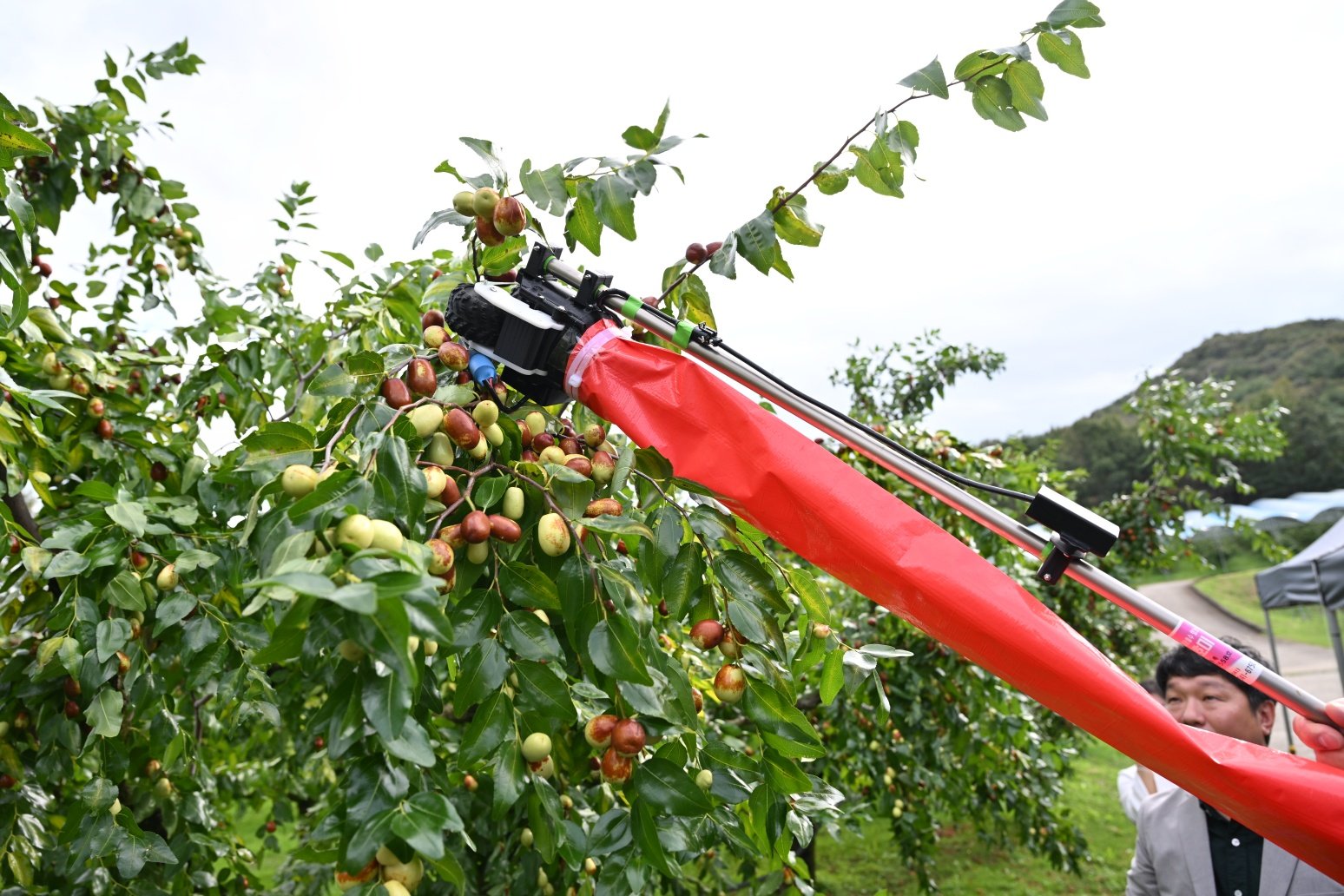 충북농기원, 대추 신품종과 휴대용 수확기 공개 (사진제공=충청북도) [PEDIEN] 충북농업기술원 대추연구소가 농촌의 고질적인 인력난 해소와 대추 산업 경쟁력 강화를 위해 신품종 3종과 휴대용 수확 기술을 동시에 공개했다. 연구소는 보은대추축제를 앞둔 지난 15일 농업인과 관계자를 대상으로 신품종 평가회 및 수확기 연시회를 개최하고 개발 성과를 공유했다.이번에 선보인 신품종은 '태복', '태후', 그리고 가공용으로 유망한 'CBJ0040' 등 총 3종이다. 이 품종들은 생과 소비가 많은 국내 시장 특성에 맞춰 맛과 기능성을 강화하는 데 초점을 맞췄다.특히 '태복'은 재래종과 왕대추의 중간 크기(약 25g)로 당도가 30브릭스에 달하는 강한 단맛이 특징이며 저장성이 뛰어나다. 대과형 품종인 '태후'(약 31g)는 수분 함량이 높고 아삭한 식감을 자랑하며, 항산화 플라보노이드 함량이 기존 품종 대비 5배나 높아 기능성 측면에서 주목받는다.소과형 품종인 'CBJ0040'(12g)은 새콤달콤한 맛이 특징이며, 비타민C와 플라보노이드 함량이 기존 '복조' 품종보다 각각 2배, 3배 높아 가공용으로 활용 가치가 높다. 연구소는 이 품종에 대해 2026년 품종보호출원을 추진할 계획이다.대추 수확은 그동안 손으로 일일이 따야 했기 때문에 인력 소모가 극심했고, 높은 곳의 과실을 수확할 때는 사다리 작업으로 인한 낙상 위험이 항상 따랐다. 이에 연구소는 농작업 안전성을 높이고 피로도를 줄일 수 있는 전동식 휴대용 수확기를 개발했다.이 수확기는 배터리로 구동되며, 전동식 롤러가 회전하면서 과실을 안전하게 감싸 분리하는 방식이다. 롤러에 탄성 소재를 적용해 과피 손상을 최소화하도록 설계됐다. 연구소는 시제품 검증을 마치는 대로 특허를 출원하고, 2026년 수확기에 맞춰 농가에 보급할 방침이다.도 농업기술원 이채영 육종재배팀장은 "생과 소비가 많은 대추의 특성상 품종 개발과 수확 기술 개발이 동시에 이루어져야 한다"며 "신품종 보급과 수확기 상용화를 통해 농가 소득 향상과 작업 안전성 확보에 최선을 다하겠다"고 강조했다. -