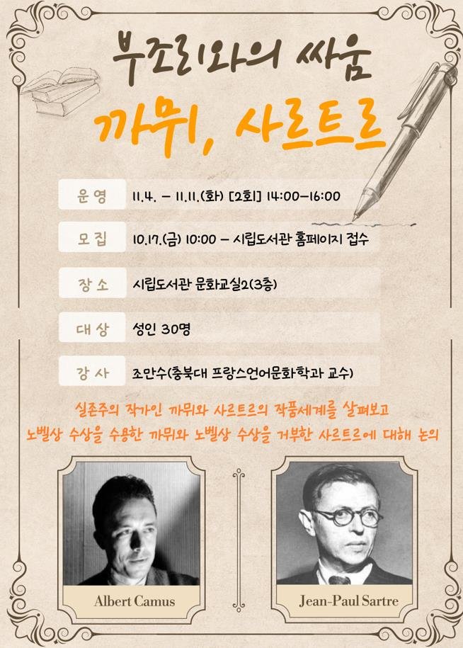 청주시립도서관, ‘부조리와의 싸움 까뮈, 사르트르’ 강연 개최 (사진제공=청주시) [PEDIEN] 청주시립도서관이 20세기 문학과 철학의 거장인 알베르 까뮈와 장 폴 사르트르의 삶과 사상을 조명하는 특별 인문 강연을 마련한다. 이번 강연은 '부조리와의 싸움: 까뮈, 사르트르'를 주제로 11월 4일과 11일 총 2회에 걸쳐 진행된다.이번 프로그램은 시민들에게 인문학적 성찰의 기회를 제공하고, 실존주의 대표 작가들의 작품 세계를 깊이 있게 탐구하기 위해 기획됐다. 강연은 충북대학교 프랑스언어문화학과 조만수 교수가 맡는다.특히 조 교수는 노벨문학상을 수용한 까뮈와 이를 거부한 사르트르의 상반된 태도를 중심으로 강연을 전개한다. 두 거장이 던지는 실존적 질문과 인간이 '부조리'에 대응하는 방식에 대해 심도 있는 논의가 이뤄질 예정이다.참가자들은 작품과 철학을 넘나드는 강연을 통해 인간 존재의 의미와 자유, 윤리 등 근본적인 문제들을 사유하는 시간을 갖게 될 것으로 기대된다. 강연은 양일 모두 오후 2시부터 4시까지 시립도서관 문화교실2(3층)에서 열린다.프로그램 참여를 원하는 시민은 오는 17일 오전 10시부터 청주시 시립도서관 누리집을 통해 신청할 수 있다. 자세한 사항은 도서관 누리집 공지사항을 참고하거나 전화 문의를 이용하면 된다. -
