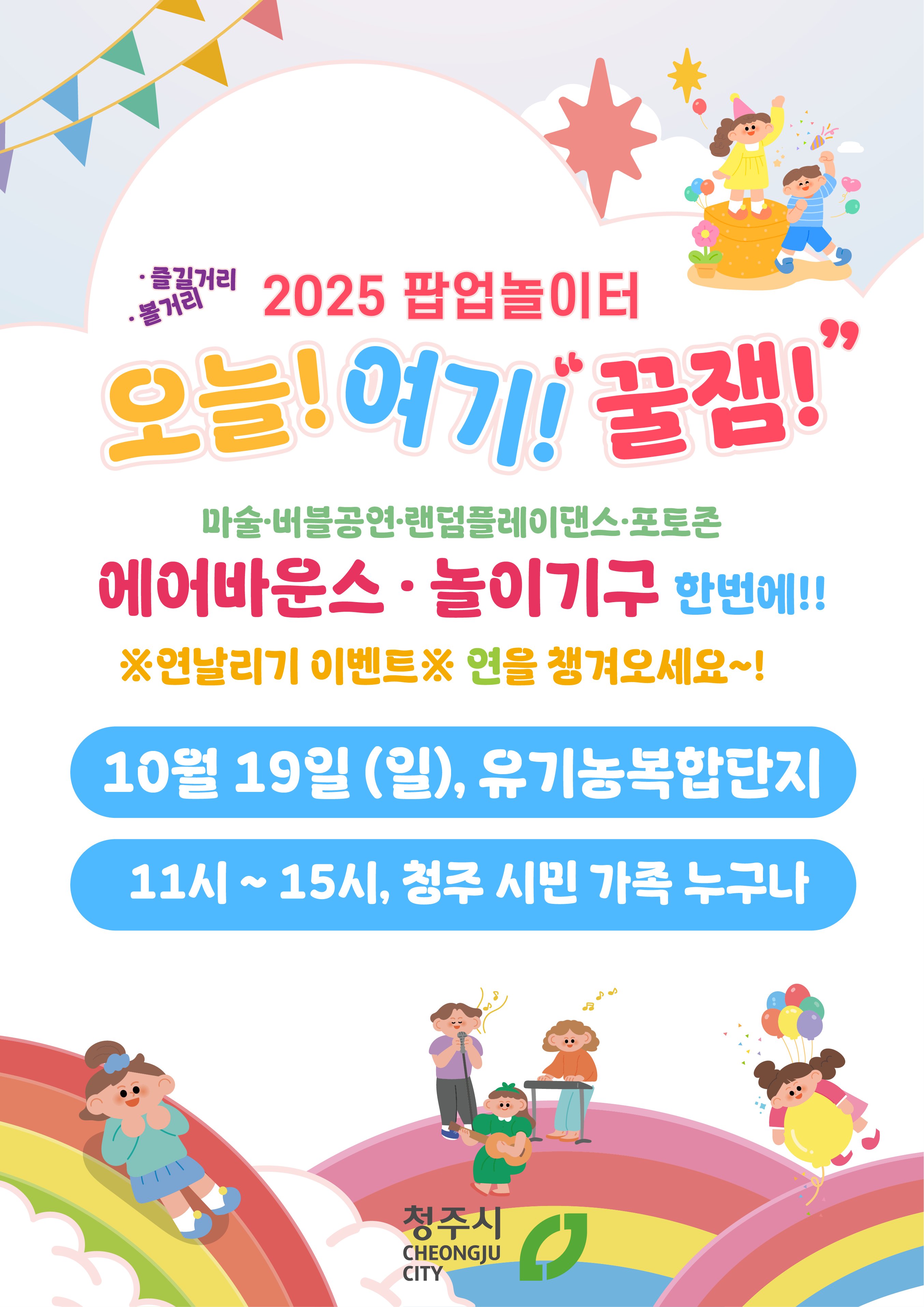 청주시, 유기농복합단지 팝업 놀이터 18일→19일 변경 개최 (사진제공=청주시) [PEDIEN] 청주시가 주말 가족 단위 방문객을 위해 준비한 대규모 야외 놀이 행사가 비 예보로 인해 하루 연기되어 19일 문을 연다. 시는 당초 18일 개최 예정이었던 '오늘! 여기! 꿀잼' 팝업 놀이터를 19일 오전 11시부터 오후 3시까지 유기농복합단지에서 운영한다고 밝혔다.올해 6회차를 맞이하는 이번 행사는 기존 구성의 신선도를 높이기 위해 새로운 놀이기구와 다채로운 체험 프로그램을 대거 도입했다. 청주시는 비가 그친 후 쾌적한 날씨 속에서 아이들이 마음껏 뛰어놀 수 있도록 안전 관리에 만전을 기할 방침이다.놀이존에는 아이들에게 인기가 높은 바이킹, 회전비행기, 워터롤러 등 대형 놀이기구와 에어바운스, 챌린지바운스가 설치된다. 또한 야구, 축구 등 게임형 체험도 함께 운영되어 활동적인 재미를 더한다. 주 무대에서는 마술, 버블, 디제잉 공연이 펼쳐지며, 온 가족이 참여할 수 있는 신나는 가족운동회도 진행된다.특히 지난 회차에서 큰 호응을 얻었던 연날리기 프로그램이 이번에도 이어진다. 개인 연을 지참한 가족은 현장에서 열리는 연날리기 대회에 참여해 특별한 추억을 만들 수 있다.체험존에서는 페이스페인팅, 풍선아트, 투호, 제기차기 등 민속놀이를 무료로 즐길 수 있다. 청주시 육아종합지원센터와 드림스타트 등 유관 기관도 참여해 아동 만들기 체험, 키링 만들기, 비눗방울 체험 등 교육적이면서도 흥미로운 프로그램을 제공한다.모든 프로그램은 무료로 운영되며, 캐릭터 포토존과 푸드트럭이 마련되어 방문객의 편의성을 높였다. 청주시 관계자는 “가족이 함께 웃고 즐길 수 있는 시간을 선사할 수 있도록 안전한 운영에 최선을 다하겠다”고 강조했다.한편, 청주시 팝업 놀이터는 11월 1일까지 매주 토요일(기상 상황에 따라 변경 가능) 계속된다. 남은 일정은 10월 25일 무심천체육공원, 11월 1일 문암생태공원 등이다. -