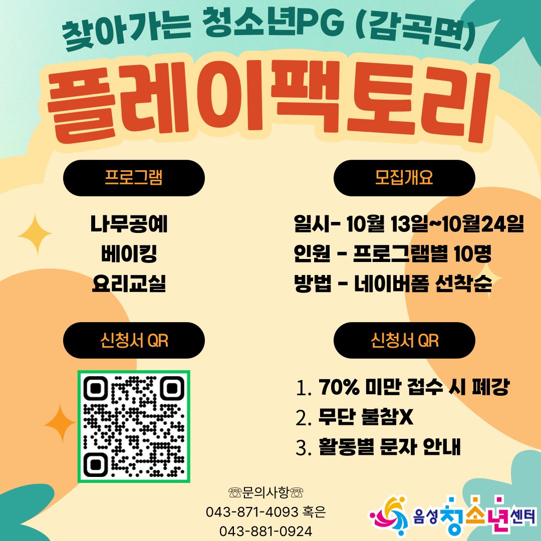 사진(안내문) 제공 (사진제공=음성군) [PEDIEN] 음성청소년센터가 활동 시설 접근성이 낮은 지역 청소년들을 위해 직접 찾아가는 프로그램을 운영하며 지역 활동 평준화에 나선다. 센터는 11월 1일부터 23일까지 감곡면 청소년을 대상으로 ‘감곡 플레이팩토리’를 진행한다고 13일 밝혔다.이번 프로그램은 지리적 제약으로 인해 청소년 활동 참여 기회가 적었던 감곡면 지역 청소년들에게 다양한 문화 체험 기회를 제공하기 위해 기획됐다. 이는 음성군 내 청소년 활동의 지역적 불균형을 해소하고, 모든 청소년이 동등한 활동 기회를 누릴 수 있도록 지원하는 데 목적이 있다.‘감곡 플레이팩토리’는 청소년들의 흥미를 유발할 수 있는 총 3가지 주제로 구성됐다. 주요 프로그램은 나무공예, 베이킹, 그리고 요리교실 등이다. 모든 활동은 감곡면 소재 감곡어울림센터에서 총 3회차에 걸쳐 진행될 예정이다.모집 대상은 음성군에 거주하는 청소년이며, 각 프로그램당 10명씩 총 30명을 선착순으로 모집한다. 특히 찾아가는 프로그램의 취지를 살려 감곡면 거주 청소년을 우선적으로 선발할 방침이다.접수는 이달 24일까지 포스터에 명시된 QR코드를 통해 진행된다. 프로그램에 대한 자세한 사항은 음성청소년센터로 문의하면 안내를 받을 수 있다. -