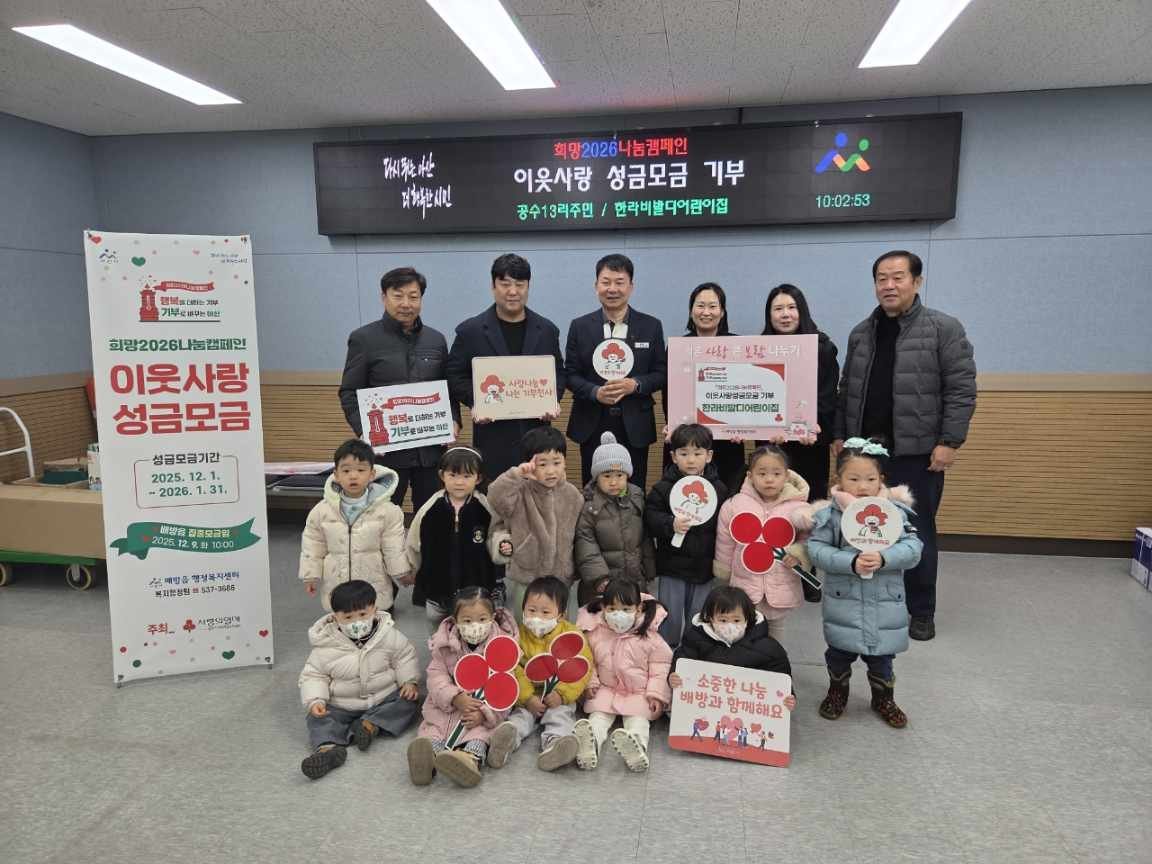 아산시 배방읍 공수13리·한라비발디어린이집, 이웃사랑 성금 기부 (아산시 제공) [PEDIEN] 아산시 배방읍에서 공수13리 주민들과 한라비발디어린이집이 어려운 이웃을 위한 따뜻한 마음을 전했다.희망2026나눔캠페인이 진행 중인 가운데, 이들의 성금 기탁 소식이 지역 사회에 훈훈함을 더하고 있다.공수13리 주민들은 마을 주민들의 소중한 마음을 모아 이웃사랑 성금 모금에 동참했다. 이들은 주변의 어려운 이웃들에게 따뜻한 위로를 전하고자 성금을 기탁했다고 밝혔다.한라비발디어린이집의 어린이들은 나눔의 의미를 배우는 특별한 시간을 가졌다. 아이들은 직접 기부에 참여하며 작은 손길이지만 어려운 가정에 큰 도움이 되기를 바라는 마음을 담았다.강한용 배방읍장은 매년 지속적인 나눔을 실천하는 주민들과 어린이집에 감사의 뜻을 전했다. 기부된 성금은 지역 내 도움이 필요한 이웃들에게 소중하게 전달될 예정이다.한편, 희망2026나눔캠페인은 2025년 12월부터 2026년 1월까지 진행되는 연말연시 집중 모금 행사다. 모금된 성금은 충남사회복지공동모금회를 통해 취약계층 지원과 지역 복지 향상을 위해 사용된다. -