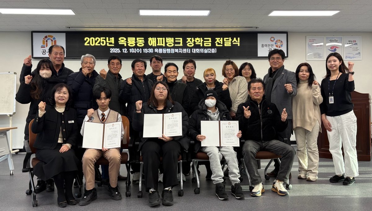 공주시 옥룡동 해피뱅크, 사랑의 장학금 전달 (공주시 제공) [PEDIEN] 공주시 옥룡동 해피뱅크가 지난 10일, 옥룡동 행정복지센터에서 지역 학생 3명에게 장학금을 전달했다.올해로 12회를 맞이한 해피뱅크 장학금은 옥룡동 통장협의회의 주관으로 운영된다. 지역 내 기관, 단체, 그리고 주민들이 자발적으로 기부에 참여하여 조성된 기금으로 운영된다.매월 5천 원 이상 기부하는 방식으로 마련된 기금은 연말연시, 경제적으로 어려움을 겪는 중·고등학생들에게 장학금으로 지원된다. 올해는 학생 3명에게 각각 30만 원씩 총 90만 원의 장학금이 전달되었다.김갑제 옥룡동 통장협의회장은 장학금 전달이 학생들에게 조금이나마 힘이 되기를 바란다고 밝혔다. 또한 앞으로도 지역 주민과 사회단체의 지속적인 관심과 협조를 통해 나눔 활동을 이어갈 것을 약속했다.이기숙 옥룡동장은 해피뱅크 장학금에 대한 꾸준한 관심에 감사를 표했다. 더불어 이번 장학금이 학생들이 학업에 더욱 전념할 수 있는 계기가 되기를 희망하며, 따뜻한 겨울을 보내기를 바란다고 전했다. -