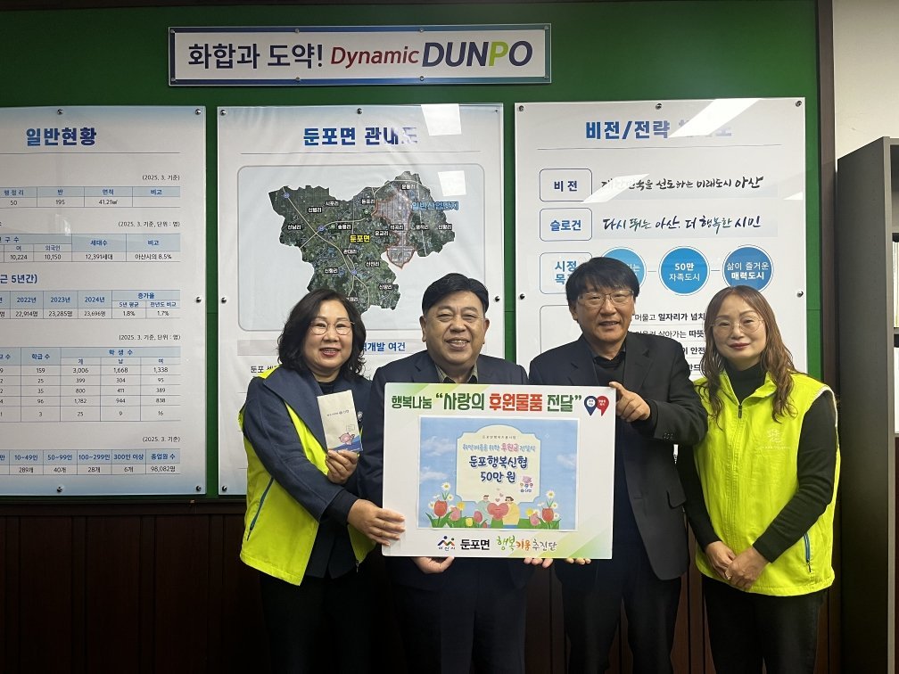 행복신협, 아산시 둔포면 행복키움추진단에 후원금 전달 (아산시 제공) [PEDIEN] 행복신협이 아산시 둔포면의 어려운 이웃들을 위해 따뜻한 나눔을 실천했다.지난 9일, 행복신협은 둔포면 행복키움추진단에 취약계층 지원을 위한 후원금 50만원을 전달했다. 이번 후원금은 지역 내 저소득 가정을 위한 복지사업에 사용될 예정이다.임기선 행복신협 이사장은 “연말을 맞아 어려운 이웃들에게 조금이나마 힘이 되기를 바란다”며 지속적인 나눔 활동 참여를 약속했다.이모완 둔포면장은 행복신협의 꾸준한 관심과 지원에 감사를 표하며, 후원금이 필요한 주민들에게 정확히 전달될 수 있도록 노력하겠다고 밝혔다.한편, 행복신협은 지난 10월에도 저소득층을 위한 겨울 이불을 지원하는 등 꾸준한 후원 활동을 통해 지역사회 나눔 문화 확산에 기여하고 있다. -
