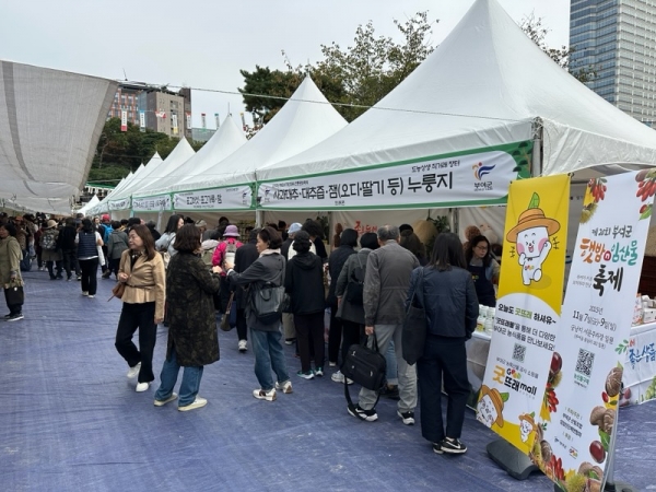 부여군 굿뜨래 농산물, 전통문화 속 가치가 빛나다 [PEDIEN] 부여군은 지난 10월 21일부터 23일까지, 서울 봉은사에서 열린‘개산 1231주년 봉은사 개산대재 직거래장터’에 참여해 많은 신도와 관람객들의 관심과 호응을 얻었다. 2024년 봉은사와 업무협약을 체결한 이후 두 번째로 참여하는 이번 장터는 단순 판매를 넘어, 도시 소비자에게 부여군의 우수한 농·특산물을 직접 소개하며 지역 경제 활성화에 이바지하는 ‘도농 상생’의 의미를 지니고 있다. 이번 직거래장터에서 부여군은 밤, 대추, 표고버섯 등 부여 10품의 대표 품목을 중심으로 제철 농·특산물을 판매해 ‘굿뜨래’ 농산물에 대한 도시 소비자들의 높은 관심을 확인했으며 지역 농·특산물에 대한 소비자들의 적극적인 구매가 이어져 성공적인 판매 성과를 거뒀다. 특히 현장 판매자들이 백제 전통 의복을 착용하고 소비자들을 맞이했다. 으로써, 부여군의 문화적 정체성을 깊이 각인시키고 부여군 공동브랜드 캐릭터인 ‘굿뜨리’ 인형을 동반해 차별화된 홍보 전략을 펼쳤다. 또한, 부여군은 이번 행사에서 제22회 백제고도부여국화축제 및 2025 햇밤 ⓝ 임산물 축제 등 부여군의 주요 가을 축제를 병행 홍보하며 도시민들의 방문을 적극 유도했다. 이번 홍보 활동에는 부여군의회 장소미 산업건설위원장도 직접 동참해 힘을 보탰는데, 장 위원장은 소비자와 직접 소통하며 부여군 농산물‘굿뜨래’의 우수성을 강조하고 지역 축제에 대한 기대감을 높이는 데 이바지했다. 군 관계자는“이번 행사는 수도권 소비자들에게 부여의 우수한 농산물을 선보이는 중요한 교류의 장이었다”며 “앞으로도 봉은사와 지속적인 협력을 통해 도농 교류를 더욱 확대하고 농가 소득 증대와 지역 경제 활성화에 이바지하는 상생 모델을 구축해 나가겠다”고 밝혔다. 한편 부여군은 이번 직거래장터의 성공을 발판 삼아, 앞으로도 다양한 도시민 접점 행사에 참여해 지역의 우수한 농·특산물 판로를 개척하고 브랜드 가치를 높여나갈 계획이다. -