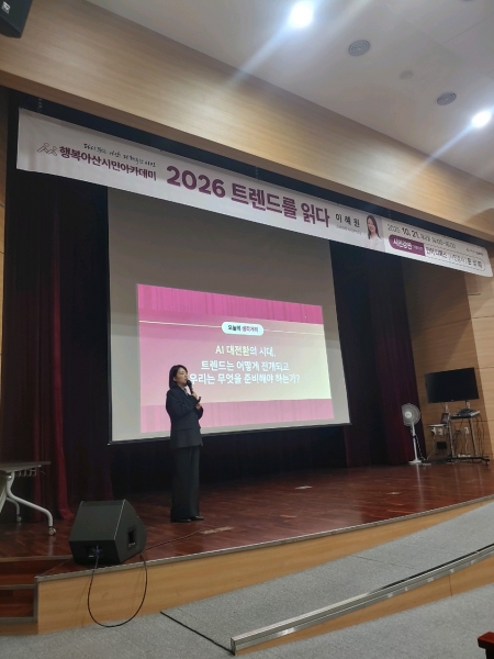 아산시, 10월 행복아산 시민아카데미 성황리 개최 [PEDIEN] 아산시는 21일 배방읍 행정복지센터 다목적홀에서 ‘행복아산 시민아카데미’ 다섯 번째 강연으로 이혜원 교수의 ‘2026 트렌드를 읽다’ 특강을 개최했다고 밝혔다. 이혜원 교수는 ‘트렌드코리아 2025’, ‘대한민국 외식트렌드 Vol.2: 나만의 먹킷리스트를 찾아서’, ‘트렌드코리아 2020~2026’ 등을 저술했으며 현재 서울대 소비트렌드분석센터 연구위원으로 재직 중이다. 이날 강연에서 이 교수는 서울대 소비트렌드분석센터가 제시한 2026년 유행 핵심어 ‘켄타우로스’를 중심으로 변화하는 소비 환경과 사회 흐름을 설명했다. ‘켄타우로스’는 인간의 감성과 판단, 가치에 인공지능의 추진력과 실행력이 결합된 개념으로 급변하는 시대에 ‘속도보다 방향’ 이 중요하다는 메시지를 전했다. 본 강연에 앞서 문남희 시민강사가 ‘언어 해독’를 주제로 사전 특강을 진행하며 시민들에게 의미 있는 시간을 선사했다. 한편 ‘2025 행복아산 시민아카데미’의 마지막 강연은 오는 11월 18일 음봉어울샘도서관에서 안정은 강사의 ‘달리기가 변화시킨 삶’ 이라는 주제로 진행될 예정이다. -