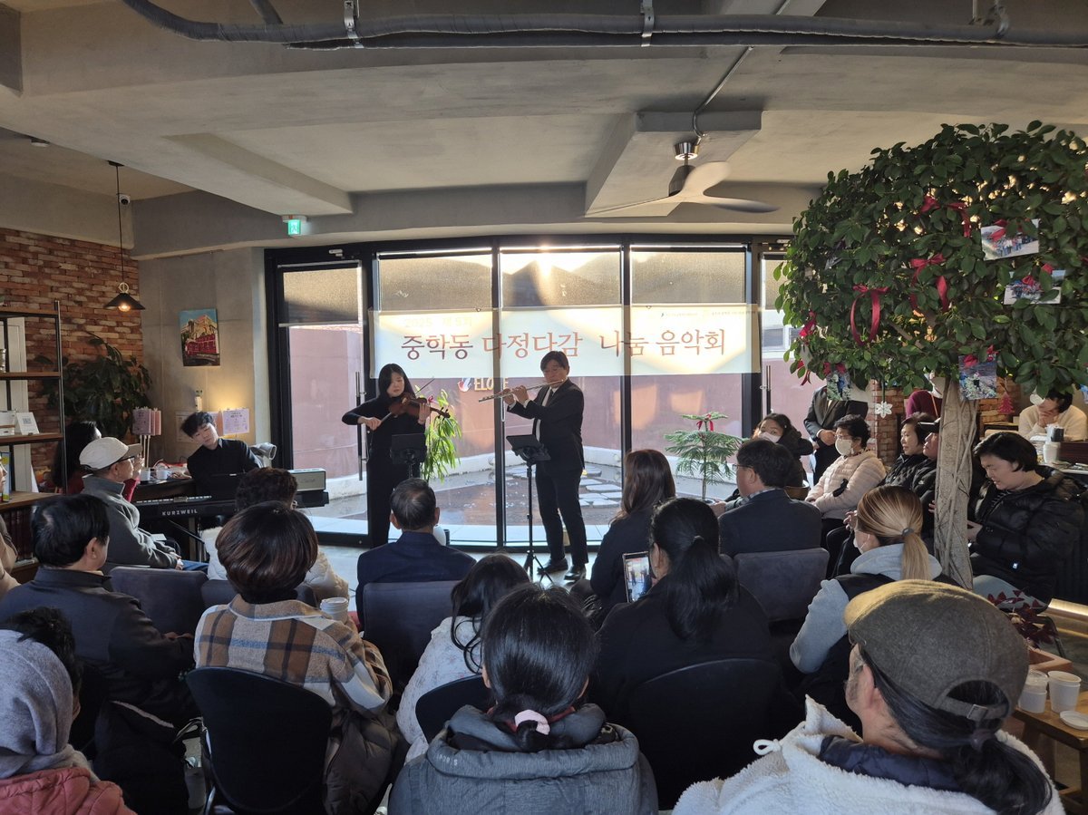 공주시 중학동, ‘다정다감 나눔 음악회’열어 이웃사랑 실천 (공주시 제공) [PEDIEN] 공주시 중학동은 지난 9일 엘로이즈 카페에서 성탄을 앞두고 ‘다정다감 나눔 음악회’를 열었다.이번 음악회는 중학동지역사회보장협의체와 공주기독교종합사회복지관이 함께 마련한 행사로, 문화와 예술을 접하기 어려운 주민에게 문화 향유 기회를 제공하기 위한 뜻깊은 자리였다.음악회는 올해로 5년째 이어지고 있으며, 연주 기획과 전체 진행은 성유진 대표가 맡았다.연주는 조권행을 중심으로 송단비, 유모세, 조권행의 앙상블이 아름다운 선율을 선보여 큰 갈채를 받았다.행사에는 공달리 수급자, 다문화가족 등 저소득 취약계층도 초대되어 함께 음악을 즐기고 나눔의 시간을 가졌다.나눔 행사에는 이림 중학동 명예동장이 핸드솝을, 중학동주민자치회가 그림 도구와 과자 35팩을, 공주맘들의 사랑방카페가 학용품 10팩을 후원했다.또한 본죽&비빔밥 공주월송점이 죽 22팩을, 공주시상가번영회가 라면 53상자를 성탄과 연말을 맞아 정성껏 마련해 따뜻함을 더했다.음악회 장소는 ‘카페 엘로이즈’가 무상으로 제공했으며, 관람객에게 제공된 차와 음료 또한 모두 후원으로 마련됐다.카페 엘로이즈는 평소에도 다문화행복모임에 꾸준히 간식을 지원해 오고 있다.행사 사회는 공주기독교종합사회복지관 운영위원인 전홍남 씨가 재능기부로 맡아 음악회의 품격을 더했으며, ‘다정다감 나눔 음악회’가 5년째 변함없이 이어지는 데 보탬이 됐다.김재철 중학동장은 “다정다감 나눔 음악회는 준비 과정부터 마무리까지 모든 절차가 기부로 이루어지는 뜻깊은 행사”라며 “이 사업에 함께해 준 개인, 기관, 단체에 깊이 감사드린다. 앞으로도 문화 향유 사업이 꾸준히 이어질 수 있도록 관심과 노력을 기울이겠다”고 말했다. -