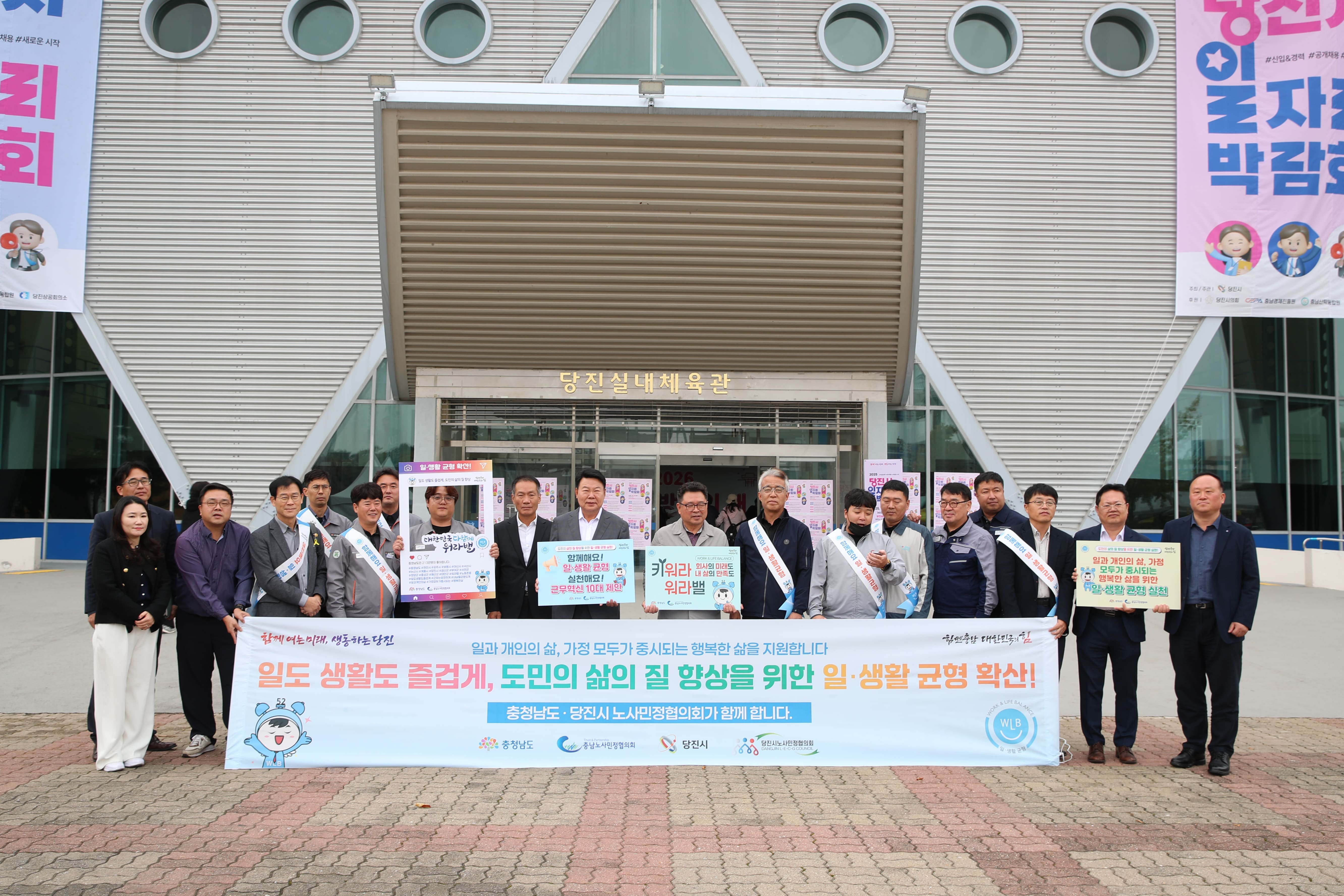 공동선언 릴레이 캠페인 [PEDIEN] 당진시가 충남노사민정협의회와 손잡고 지난 21일 당진실내체육관에서 '일·생활 균형 확산 및 노동 전환 지원을 위한 공동선언 릴레이 캠페인'을 개최했다.이번 캠페인은 2025년 충남노사민정 공동선언의 일환으로, 근로시간 단축 문화 정착과 정의로운 노동 전환에 대한 사회적 공감대를 넓히기 위해 마련됐다.이날 행사에는 충남도, 충남노사민정협의회, 당진시 노사민정협의회 관계자 20여 명이 참석했다. 오성환 당진시장도 일자리박람회 현장을 찾아 시민들과 소통하며 '일·생활 균형' 문화 확산을 독려했다.캠페인에서는 일자리박람회 방문객을 대상으로 홍보 물품 배부, 사진 촬영 장소 운영, 캠페인 서명 등 다양한 참여 프로그램이 진행되어 시민들의 큰 호응을 얻었다.당진시는 이번 캠페인을 통해 일과 생활의 균형이라는 가치가 지역사회 전체로 확산되기를 기대하고 있다. 시 관계자는 근로자와 기업 모두가 행복한 일터 문화를 조성할 수 있도록 지속적인 노력을 기울일 것이라고 밝혔다. -