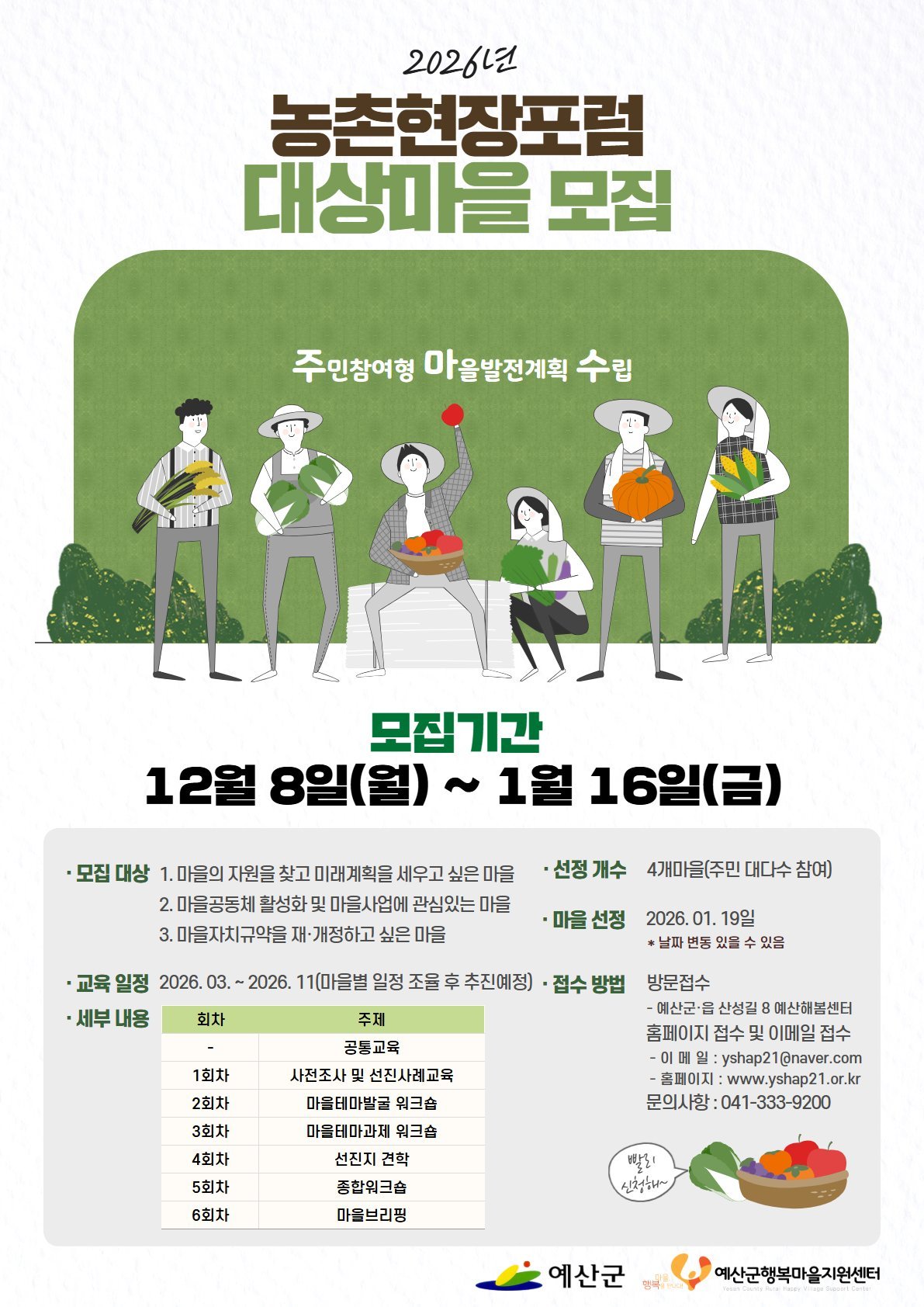 예산군, 2026년 주민주도 마을발전계획수립 대상마을 모집 (예산군 제공) [PEDIEN] 예산군이 2026년까지 주민 주도로 마을 발전 계획을 수립할 마을을 모집한다고 밝혔다. 이번 사업은 주민 스스로 마을의 중장기 실행 계획과 자치 규약을 마련하도록 지원하는 프로그램이다.마을 자원 조사, 테마 발굴, 실행 과제 도출, 워크숍, 마을 브리핑 등의 과정을 거쳐 주민 역량 강화와 실천 가능한 지역 발전 모델을 구축하는 데 목적을 둔다.예산군은 총 4개 마을을 선정하여 계획 수립의 전 과정을 지원할 계획이다. 신규 추진 마을뿐만 아니라 기존 농촌 지역 개발 사업 추진 경험이 있는 마을도 신청 가능하다. 특히, 현안 해결이나 활력 회복이 필요한 마을에 기회가 주어진다.신청 및 문의는 예산군청 농정유통과 농촌활력팀, 각 읍면 행정복지센터, 행복마을지원센터에서 가능하다. 예산군은 이번 계획 수립 지원을 통해 마을 공동체 활성화와 지속 가능한 지역 발전 기반을 마련할 수 있을 것으로 기대한다.군 관계자는 주민 주도 마을 발전 계획 수립이 마을 공동체 활성화와 지속 가능한 지역 발전 기반 마련에 중요한 계기가 되기를 바란다며 관심 있는 마을의 적극적인 참여를 당부했다. -