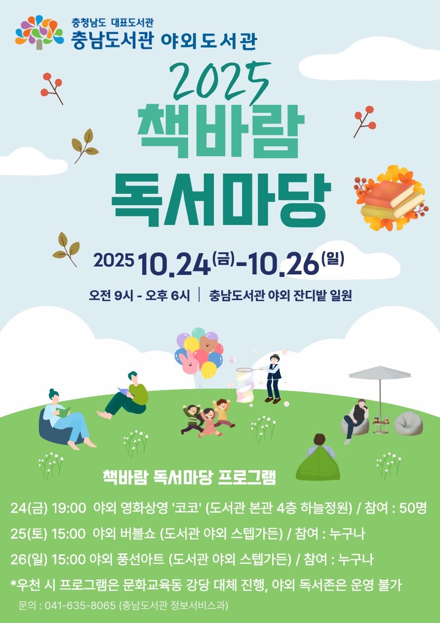 책바람_독서마당_포스터 [PEDIEN] 충남도서관은 오는 24∼26일 충남도서관 일원에서 ‘2025 책바람 독서마당’야외도서관 행사 및 문화 프로그램을 진행한다고 23일 밝혔다.책바람 독서마당은 충남도서관이 실내 독서 공간을 뛰어넘어 자연과 어우러져 독서와 휴식, 체험을 함께 즐기는 야외도서관으로 외연을 넓히고 도서관 이용객에게 색다른 독서 경험을 제공하고자 추진하는 독서문화 행사다.충남도서관은 본관 앞 잔디밭 일원에 빈백(beanbag), 그늘막, 캠핑 의자 및 탁자 등 방문객이 자유롭게 이용할 수 있는 독서 공간을 조성해 이용자들을 기다릴 예정이다.또 돗자리와 독서등, 작은 탁자, 좌식 의자 등을 포함한 책 바구니를 대여해 도서관 구역 내 별도 야외 공간에서 편하게 독서를 즐길 수 있도록 기회를 제공한다.주요 문화 프로그램으로는 △24일 오후 7시 야외 영화 상영 ‘코코’ △25일 오후 3시 야외 비눗방울 공연(버블쇼) △26일 오후 3시 야외 풍선 예술 공연 등 어린이 동반 가족 단위 방문객이 재미있게 즐길 수 있는 공연 위주로 구성했다.충남도서관 관계자는 “문화의 달 10월을 맞아 도서관 안팎에서 독서와 함께 다양한 문화생활을 즐길 수 있도록 이번 야외도서관 행사를 운영한다”며 “앞으로도 다양한 영역의 문화 체험 기회를 제공해 지역사회 복합문화공간의 역할을 다할 것”이라고 말했다. -