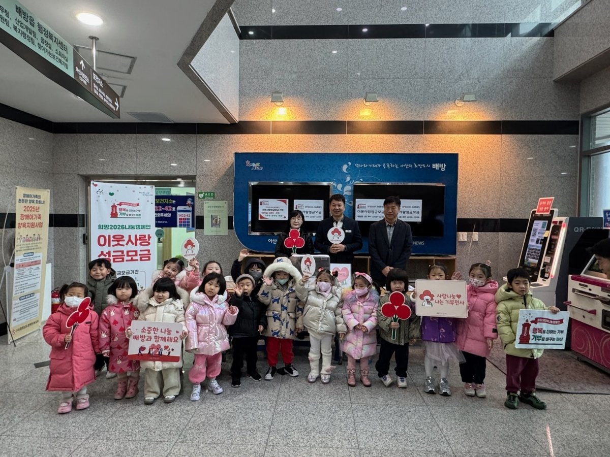 아산시 배방읍, ‘희망2026나눔캠페인’이웃사랑 성금모금 행사 개최 (아산시 제공) [PEDIEN] 아산시 배방읍이 지난 9일, 배방읍 행정복지센터에서 '희망2026 나눔캠페인' 집중 모금 행사를 열었다.'행복을 더하는 기부, 기부로 바꾸는 아산!'이라는 슬로건 아래 진행된 이번 캠페인은 연말연시 어려운 이웃을 돕기 위한 따뜻한 마음을 모으는 자리로 마련됐다.이날 행사에는 마을 이장단, 기관·단체, 노인회, 어린이집 등 각계각층의 주민들이 자발적으로 참여해 나눔의 의미를 더했다. 특히 배방읍 내 어린이집 교직원과 원아 150여 명이 고사리손으로 정성을 모아 전달하며 행사장 분위기를 훈훈하게 만들었다.강한용 배방읍장은 “많은 주민과 단체에서 적극적으로 참여해주셔서 진심으로 감사드린다”며, “모금된 성금은 복지 사각지대에 놓인 어려운 이웃과 취약계층을 돕는 데 소중하게 사용될 것이다”라고 밝혔다.한편, 희망2026나눔캠페인은 2025년 12월 1일부터 2026년 1월 31일까지 62일간 진행되는 연말연시 집중 모금 행사다. 모금액은 충남사회복지공동모금회를 통해 관내 취약계층 지원 및 지역 복지사업에 투입될 예정이다. -