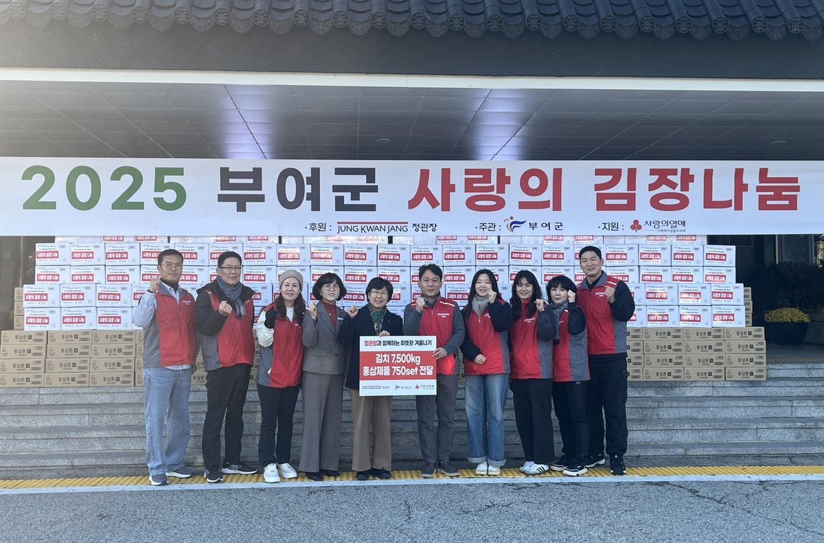 KGC 인삼공사, 김장 김치 및 홍삼 나눔 실천 - 2011년부터 꾸준히 이어온 '정관장 펀드 '활용, 김장 김치 750 박스, 홍삼 제품 750개 기탁 - (부여군 제공) [PEDIEN] KGC 인삼공사 부여공장은 지역사회 취약계층을 지원하기 위해 김장 김치 10kg 750 박스와 홍삼 제품 750 세트를 기탁했다고 10일 밝혔다.이번 기부는 KGC 인삼공사가 임직원의 자발적 참여와 회사 출연금을 더해 운영하는 사회공헌 제도인 ‘정관장 펀드 ’를 통해 마련되었으며, 기탁된 김장 김치와 홍삼 제품은 지역의 독거 어르신, 저소득 가정, 사회복지시설 등 도움이 필요한 곳에 전달될 예정이다.KGC 인삼공사는 매년 김장 나눔과 건강식품 후원 등 지역 중심의 사회공헌 활동을 지속해 왔다.지난해에도 부여군에 김장 김치와 홍삼 제품을 지원하며 지역민들의 건강한 겨울나기를 도왔으며, 올해 또한 나눔 규모를 확대해 지역사회와의 상생 의지를 다시 한번 보여주었다.KGC 인삼공사 관계자는 “연말을 맞아 지역사회에 따뜻함을 전할 수 있어 뜻깊다.”라며, “앞으로도 지역과 동행하는 기업으로서 지속적인 나눔 활동을 이어가겠다.”라고 말했다.박정현 부여군수는 “어려운 이웃들에게 꼭 필요한 시기에 큰 도움을 주신 KGC 인삼공사에 감사드린다.”라며, “기탁 물품은 도움이 필요한 가정과 시설에 신속하고 공정하게 전달하겠다.”라고 밝혔다. -