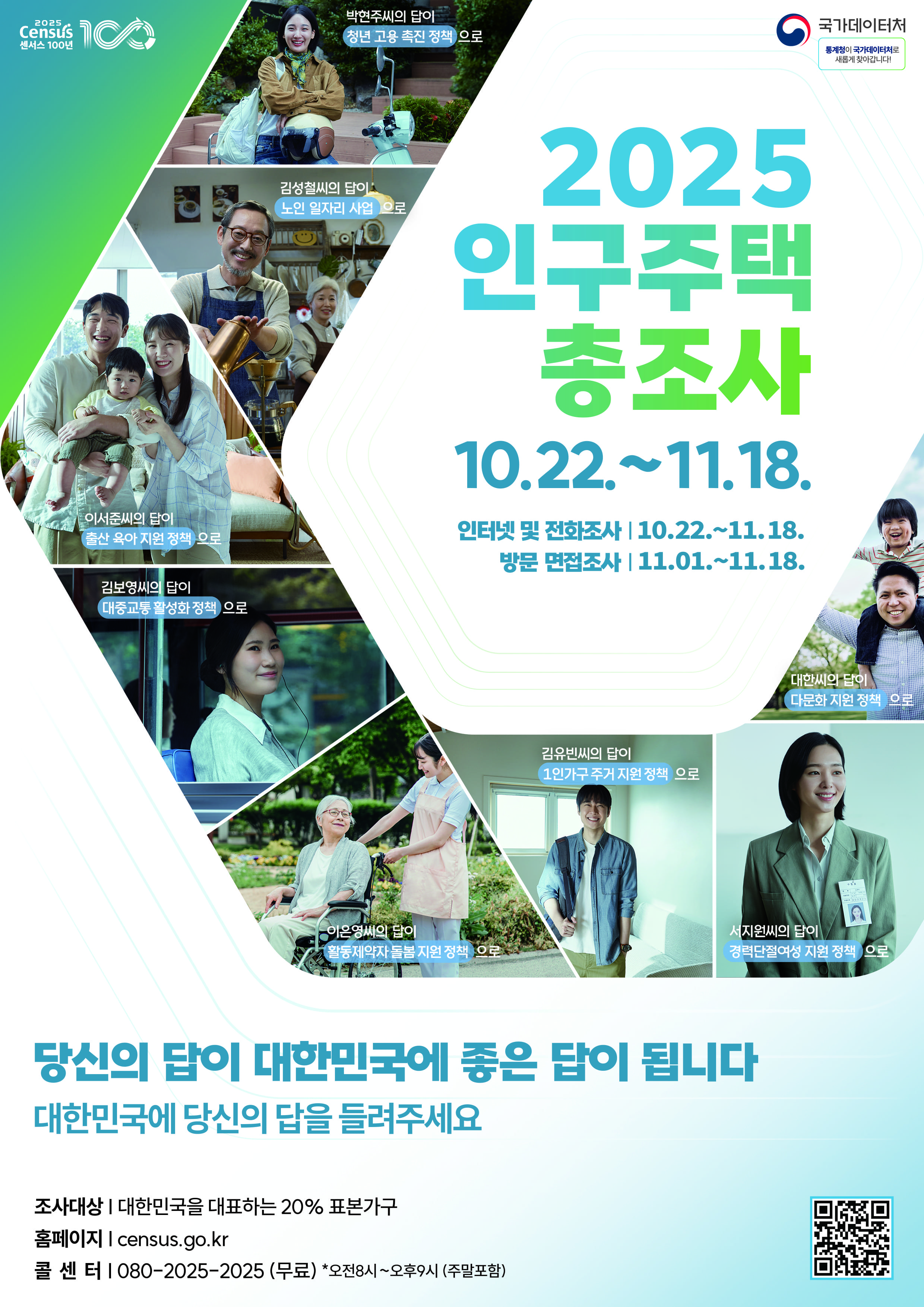 인구주택 총조사 홍보 포스터(국가데이터처) [PEDIEN] 당진시가 2025년 인구주택총조사를 10월 22일부터 11월 18일까지 실시한다고 밝혔다.이번 조사는 표본으로 선정된 21,658가구를 대상으로 진행된다.인구주택총조사는 국가의 주요 정책 수립에 필요한 기초자료를 확보하기 위해 5년마다 실시되는 국가 기본 통계조사다.조사는 모든 인구, 가구, 주택에 대한 종합적인 정보를 파악하는 것을 목표로 한다.올해는 특히 인구주택총조사 100주년을 맞이하는 해로, 사회·경제 변화와 정책 수요를 반영하여 조사 항목이 확대된다.기존 항목 외에 가족돌봄 시간, 임대 주체, 가구 내 사용 언어 등이 새롭게 조사 항목에 포함된다.조사 방법은 비대면 방식을 우선으로 한다.10월 22일부터 31일까지 인터넷 및 전화 조사를 통해 진행되며, 미응답 가구에 한해 11월 1일부터 18일까지 조사원이 직접 방문하여 면접 조사를 실시한다.수집된 조사 내용은 통계 목적으로만 사용되며, 통계법에 따라 개인 정보는 엄격하게 보호된다.조사 결과는 2025년 12월에 공표될 예정이다.당진시 관계자는 인구주택총조사에 시민들의 적극적인 참여를 당부했다. -