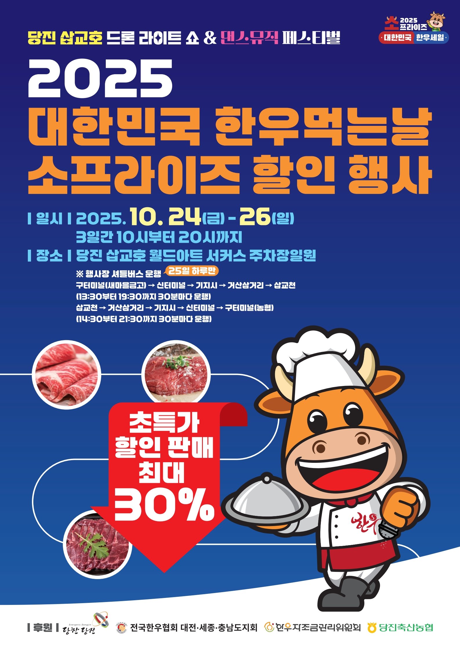 삽교천 소프라이즈 할인 행사 포스터 [PEDIEN] 당진시가 10월과 11월, 지역 축제와 연계하여 한우 소비를 촉진하는 행사를 연이어 개최한다.이번 행사는 당진을 찾는 시민과 관광객에게 당진 한우의 우수성을 알리고 소비를 활성화하기 위해 마련됐다. 풍성한 볼거리와 먹거리가 제공될 예정이다.10월 24일부터 26일까지는 삽교천 댄스&뮤직 페스티벌 현장에서 ‘2025 대한민국 한우먹는날 소프라이즈 한우 할인행사’가 열린다. 11월 1일부터 2일까지는 면천읍성 축제 현장에서 ‘면천읍성과 함께하는 한우축제’가 개최될 예정이다.행사 기간 동안 한우를 최대 30% 할인된 가격으로 판매하는 부스가 운영된다. 방문객들을 위한 룰렛 이벤트, 한우 그리기, 퀴즈 등 다양한 참여형 이벤트도 준비되어 있다.특히, 현장에서 구매한 한우를 즉석에서 구워 맛볼 수 있는 ‘구이존’도 운영하여 축제의 흥을 돋울 계획이다.당진시 관계자는 이번 행사를 통해 지역 농가의 소득 증대와 한우 소비 활성화에 기여할 것으로 기대한다. 또한, 시민과 관광객 모두가 즐길 수 있는 축제형 소비 행사로 자리매김할 수 있도록 최선을 다해 준비하겠다고 밝혔다. -