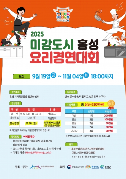 미감도시 홍성, 요리경연대회 참가자 추가 모집 [PEDIEN] 홍성군은 다음달 4일까지 ‘2025년 미감도시 홍성 요리경연대회’의 참가자를 추가 공개 모집한다고 밝혔다. ‘2025년 미감도시 홍성 요리경연대회’는 대한민국 문화도시 조성사업의 일환으로 홍성군의 특색 있는 음식문화와 로컬 레시피를 발굴하고 이를 기록해 콘텐츠화함으로써 주민주도의 창작과 향유 기반을 마련하는 데 목적이 있다. 나아가 이러한 성과를 토대로 지역 정체성 강화와 문화적 자긍심을 제고하는 것을 목표로 한다. 대회는 지역특산물을 활용한 요리를 중심으로 △주요리부문 △다과부문으로 나누어서 진행될 예정이며 지역 특색 음식을 널리 알리고 싶은 대한민국 국민을 대상으로 이루어진다. 서류접수는 11월 4일까지이며 예선을 통과한 20팀을 대상으로 오는 11월 16일 광천 문화시장에서 본선경연이 개최될 예정이다. 최종 선정된 10팀에는 시상과 함께 소정의 상금이 수여될 계획이다. 최건환 홍주문화관광재단 대표이사는 “이번 2025년 미감도시 홍성 요리경연대회가 홍성의 식문화 발전에 새로운 활기를 불어넣는 계기가 되기를 바란다”며 “이번 경연을 통해 지역 고유 음식이 국내외로 널리 알려지는 발판이 되기를 기대한다”고 밝혔다. ‘2025년 미감도시 홍성 요리경연대회’ 참가자 추가 모집 관련 사항은 홍주문화관광재단 홈페이지에서 확인할 수 있으며 문의는 홍주문화관광재단 문화도시센터로 하면 된다. -