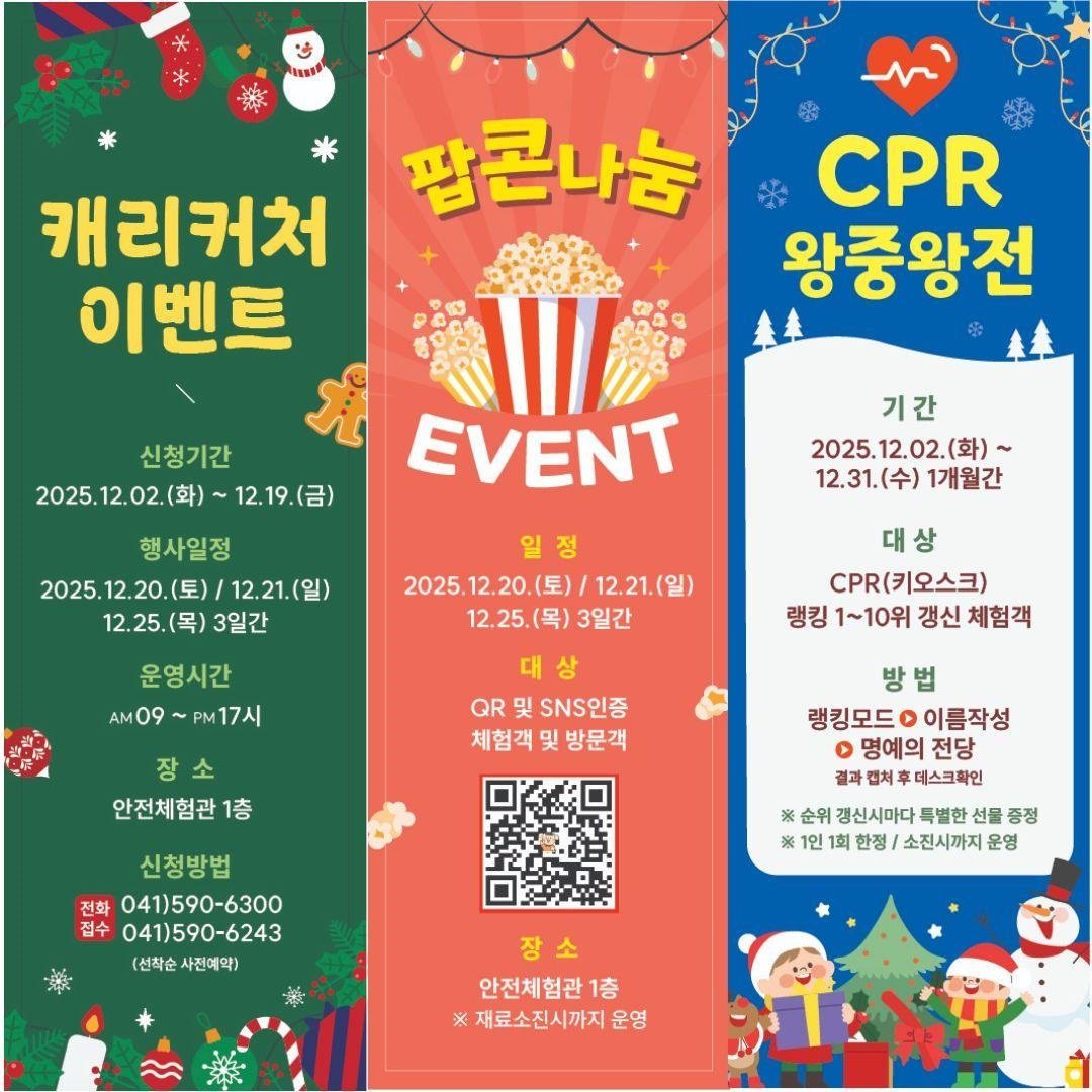 [PEDIEN] 충남소방본부 충남안전체험관이 크리스마스를 맞아 특별한 이벤트를 준비했다. 12월 31일까지 가족 단위 방문객을 대상으로 안전 의식을 함양할 수 있는 참여형 프로그램을 운영한다.이번 이벤트의 핵심은 심폐소생술 키오스크 왕중왕전이다. 체험객들은 심폐소생술 실력을 겨루고, 결과에 따라 기념품도 받을 수 있다. 재미와 교육 효과를 동시에 잡을 수 있도록 기획했다.이 외에도 다채로운 부대 행사가 마련되어 있다. 캐리커처 그리기, 팝콘 나눔 행사 등 남녀노소 누구나 즐길 수 있는 프로그램들이 준비되어 가족 방문객들의 큰 호응이 예상된다.안전체험관 측은 이번 이벤트가 단순한 체험을 넘어 작은 축제와 같은 분위기를 선사할 것으로 기대하고 있다. 박창우 충남안전체험관장은 “가족들이 즐거운 체험을 통해 자연스럽게 안전을 배우고 익힐 수 있도록 이번 이벤트를 준비했다”고 밝혔다.이어 “연말을 맞아 많은 도민들이 방문하여 따뜻한 추억을 만들고 안전교육의 가치도 함께 느껴보길 바란다”고 덧붙였다.