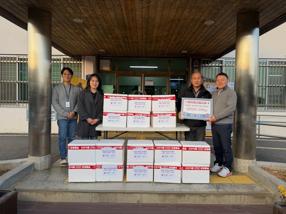공주시 우성면, 연말 맞아 따뜻한 이웃사랑 실천 (공주시 제공) [PEDIEN] 공주시 우성면은 연말을 맞아 한천리에 위치한 풀꽃마을이 어려운 이웃을 위해 김장김치 200kg을 지난 5일 기탁했다고 밝혔다.이번에 전달된 김장김치는 풀꽃마을에서 신선하고 품질 좋은 재료를 사용해 직접 정성껏 담근 것으로, 한 해 동안 받은 사랑을 지역사회에 되돌려 나누고자 하는 마음이 담겨 있다.기탁된 김장김치는 관내 소외계층과 취약가정, 홀몸어르신 등 도움이 필요한 이웃들에게 전달될 예정이다.이명숙 대표는 “추운 겨울을 앞두고 이웃들이 따뜻한 마음으로 한 해를 마무리하길 바라는 마음에서 준비했다”며 “앞으로도 지역사회에 도움이 되는 나눔 활동을 꾸준히 이어가겠다”고 말했다.이용건 우성면장은 “어려운 이웃을 위한 귀한 나눔을 실천해 주신 풀꽃마을에 깊이 감사드린다”며 “기탁된 김장김치는 도움이 필요한 가정에 신속히 전달해 따뜻한 겨울을 보낼 수 있도록 하겠다”고 밝혔다.