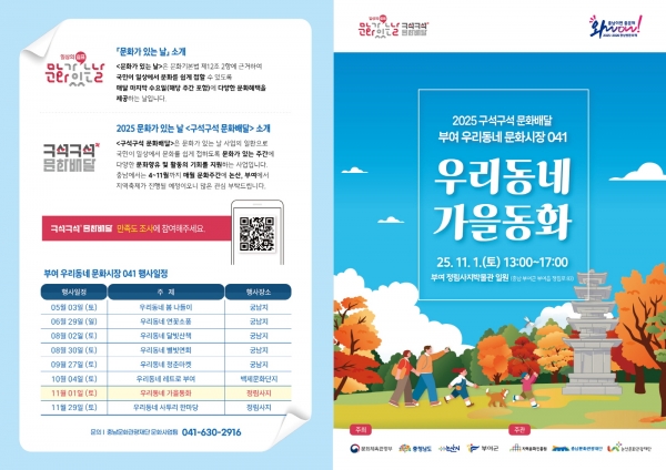 부여 정림사지, ‘문화가 있는 날 ‘구석구석 문화배달’’ 일곱 번째 이야기 [PEDIEN] 부여군은 오는 11월 1일 오후 1시부터 5시까지 정림사지 일원에서 ‘2025 문화가 있는 날 ‘구석구석 문화배달’’ 일곱 번째 이야기 ‘우리동네 가을동화’를 개최한다고 밝혔다. 이번 행사는 문화체육관광부, 충청남도, 부여군이 주최하고 지역문화진흥원과 충남문화관광재단이 주관하는 지역 밀착형 문화프로그램으로 군민이 일상에서 문화를 즐기고 함께 어울릴 기회를 제공하기 위해 마련됐다. 특히 이번 행사는 장소를 궁남지에서 정림사지로 변경하면서 원도심 활성화를 기대하고 있다. ‘우리동네 가을동화’에서는 △재즈 플로우 김홍석의 재즈 무대 △힐링 어쿠스틱 ‘푸른달’ 공연 △MC 선호의 매직 버블쇼 △남달리의 팝재즈 공연 △황금예술단 버스킹 무대 등 다채로운 공연이 펼쳐져 가을 정취와 함께 흥겨운 시간을 선사한다. 또한 레트로 체험존에서는 △대형 방방이 △레트로 오락실 △추억의 간식 △추억의 뽑기 등 어린 시절 향수를 느낄 수 있는 즐길 거리가 마련되며 123 사비공예마을에서는 △나전칠기 키링 △무드등 만들기 △팝업 전시 등 지역 공예인들의 창의와 감성을 담은 체험이 진행된다. 특히 북크닉 프로그램에서는 A 텐트를 설치하고 책을 대여해 공연을 즐기면서 책을 읽을 수 있어, 참가자들이 가을의 정취를 느끼며 여유로운 시간을 보낼 수 있다. 이와 함께 △가을 스팽글 셰이커 △나만의 모루 인형 △마시멜로 비누 △밀짚모자 편백 방향제 △비즈 리본 키링 △스마일 도어벨 △캔버스 컬러링 △캘리그라피 필통 만들기 등 남녀노소 누구나 참여할 수 있는 다양한 만들기 체험도 준비되어 있다. 부여군 관계자는 “정림사지에서 열리는 ‘우리동네 가을동화’는 공연과 체험이 어우러진 문화축제로 군민과 관광객이 함께 부여의 가을을 만끽할 수 있는 시간이 될 것”이라며 “많은 관심과 참여를 부탁드린다”고 전했다. -