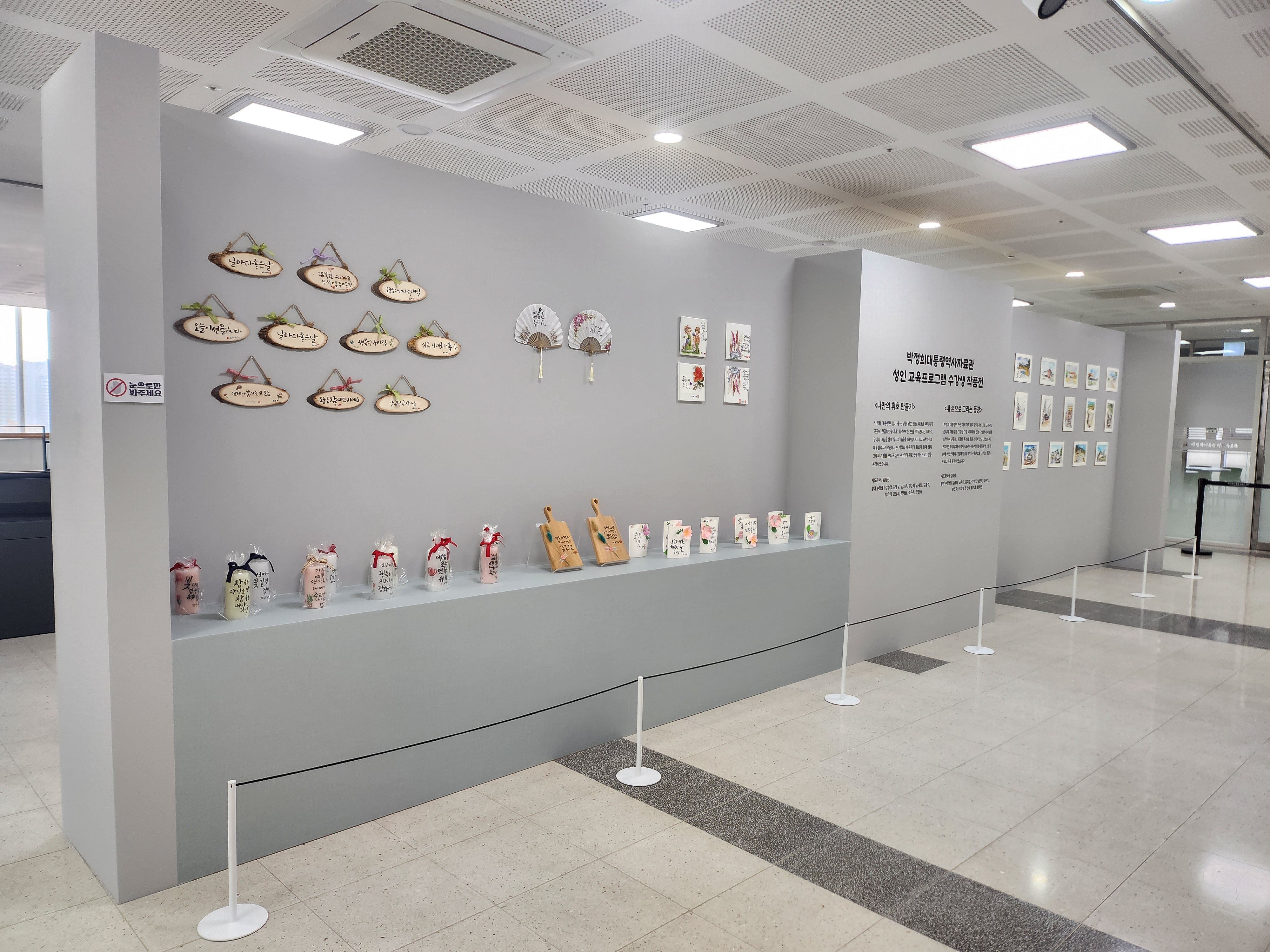 수강생 작품전(구미시 제공) [PEDIEN] 구미시 박정희대통령역사자료관이 10월 25일부터 11월 16일까지 3층 아카이브실에서 성인 수강생 작품전을 개최한다.이번 전시회는 '나만의 휘호 만들기'와 '내 손으로 그리는 풍경' 강좌 참여자들이 만든 59점의 작품을 선보인다.작품들은 박정희 대통령의 휘호와 그림에 대한 관심에서 영감을 받아 캘리그래피와 어반스케치로 표현됐다. 전통 서예와 현대적 감각이 조화를 이룬 작품들이 특징이다.전시장에는 아름다운 글씨체의 문패와 액자, 역사자료관 주변 풍경을 담은 그림 등 다양한 작품이 전시되어 관람객의 눈길을 사로잡는다.특히 박정희 대통령 추모 기간을 맞아 '대통령께 보내는 편지' 코너가 마련되어 관람객들이 직접 편지를 쓰며 추모의 마음을 전할 수 있다.역사자료관은 전문 박물관으로서 성인뿐 아니라 어린이와 청소년을 위한 교육 프로그램도 꾸준히 운영하고 있다.자료관 관계자는 이번 전시가 시민들이 역사와 문화를 체험하는 기회가 되기를 바라며, 앞으로도 지역 주민들을 위한 문화 향유의 장을 확대할 계획이라고 밝혔다. -