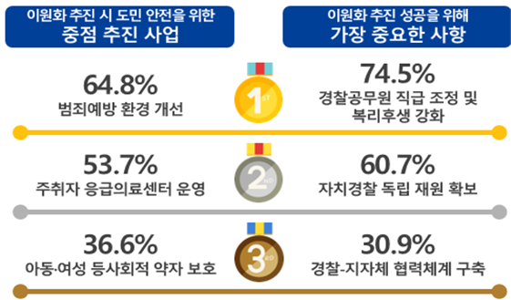 이원화 제도 추진 시 중점 추진 사업으로 도민 안전 확보를 위한 범죄예방 환경 개선사업이 꼽혔으며 제도의 안정적 정착을 위해 가장 중요한 사항으로 경찰공무원의 직급 체계 정비와 복리후생 강화가 필요하다는 의견이 가장 많았고 다음으로 자치경찰 독립 재원 확보와 경찰-지자체 협력체계 구축 순으로 조사됐다.