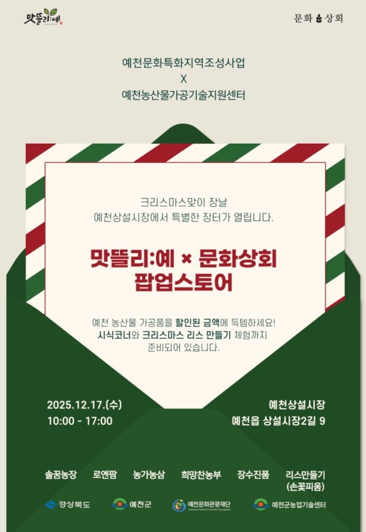예천군, 문화상회 x 맛뜰리:예 크리스마스 맞이 5일장 행사 개최 (예천군 제공) [PEDIEN] 예천군이 크리스마스를 맞아 특별한 행사를 개최한다. 예천상설시장 문화상회에서 '문화상회 맛뜰리:예' 프로그램이 열려, 지역 주민들에게 풍성한 즐거움을 선사할 예정이다.이번 행사는 예천문화관광재단 문화특화지역조성TF와 예천농산물가공지원센터의 협업으로 기획됐다. 지역 문화 예술인과 농산물 가공업자들이 힘을 합쳐, 지역 경제 활성화에 기여하고자 마련되었다.17일 오전 10시부터 오후 5시까지 진행되는 이번 행사에서는 다채로운 프로그램이 준비되어 있다. 특히, 지역 창작자들이 진행하는 '크리스마스 리스 만들기' 체험은 방문객들에게 특별한 추억을 선사할 것으로 기대된다.또한, 예천군 농산물 가공 공동브랜드 '맛뜰리:예' 소속 조합원들이 생산한 우수 가공 제품을 저렴한 가격에 만나볼 수 있다. '40초 큐브 된장국' 등 19종의 다양한 제품이 특별 할인가로 판매될 예정이다.예천군은 이번 행사를 통해 지역 문화와 농업의 상생 모델을 구축하고, 전통시장에 활력을 불어넣을 계획이다. 앞으로도 문화와 지역 산업이 어우러지는 다양한 콘텐츠를 개발하여 지역 경제 발전에 기여할 것으로 전망된다. -