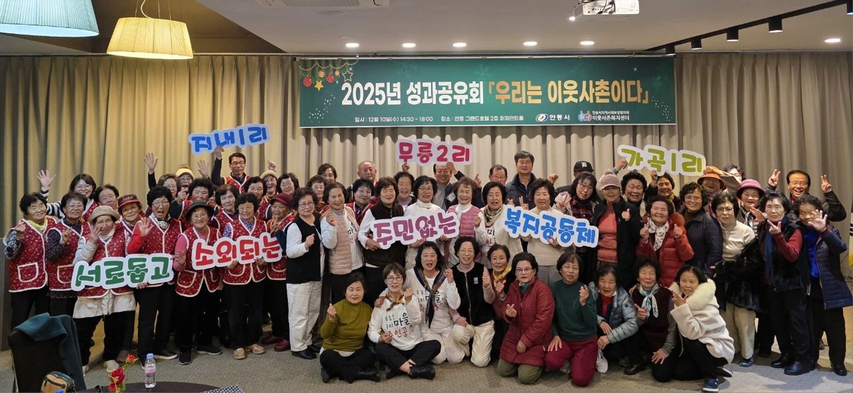 안동시이웃사촌복지센터,‘우리는 이웃사촌이다’성과공유회 개최 (안동시 제공) [PEDIEN] 안동시가 지난 10일 그랜드호텔에서 이웃사촌복지센터 성과공유회를 개최했다. 사업 관계자와 주민 70여 명이 참석하여 올 한 해 동안의 성과를 공유하고 마을 간 화합을 다지는 시간을 가졌다.이번 행사는 시범마을 주민들이 주도적으로 이뤄낸 성과를 기념하고, 공동체 의식을 높이기 위해 마련되었다. 이웃사촌복지센터 활동 영상 시청, 주민 소감 발표, 장기자랑, 레크리에이션 등 다채로운 프로그램이 진행되었다.참석자들은 각 마을의 활동 영상을 보며 성과를 공유하고, 이웃사촌공동체의 의미를 되새겼다. 장기자랑과 레크리에이션 시간에는 협동과 소통을 통해 더욱 끈끈한 공동체 의식을 다졌다.안동시 관계자는 지역 복지 발전을 위해 헌신한 주민들에게 감사를 표하며, 주민 스스로 살기 좋은 복지 공동체를 만들어갈 수 있도록 지속적인 관심과 지원을 약속했다.안동시 이웃사촌복지센터는 2023년부터 주민 조직화, 역량 강화, 마을 복지 계획 지원, 위기 가구 지원 연계 등 다양한 프로그램을 통해 지역 공동체 회복에 힘쓰고 있다. -