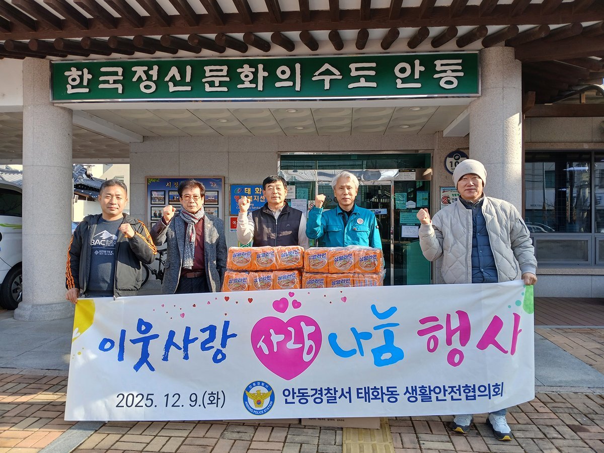 태화지구대 생활안전협의회, 취약계층 위해 라면 후원 (안동시 제공) [PEDIEN] 안동경찰서 태화지구대 생활안전협의회가 12월 10일, 태화동 행정복지센터에 라면을 기탁하며 훈훈한 나눔을 실천했다. 이번 기탁은 태화동 경로당 어르신들에게 전달될 예정이다.생활안전협의회는 올해 두 번째 라면 나눔을 통해 지역사회와의 따뜻한 연대를 이어갔다. 평소 경찰과 협력하여 지역 안전망 강화에 힘쓰는 동시에, 꾸준히 소외된 이웃을 위한 나눔 활동에 참여하며 지역사회의 귀감이 되고 있다.강낙원 생활안전협의회 회장은 “작은 정성이지만 어르신들께 도움이 되길 바란다”며 나눔에 대한 소감을 밝혔다. 제비원축산과 가든을 운영하는 강 회장은 평소 지역사회에 대한 책임감을 강조하며 나눔을 실천해 온 것으로 알려졌다. 그는 앞으로도 지역을 위한 나눔 활동을 지속하겠다는 의지를 전했다.김무경 태화동 행정복지센터 동장은 “어르신들을 위해 소중한 마음을 전해주셔서 깊이 감사드린다”고 말했다. 덧붙여 “동에서도 복지 사각지대 해소와 이웃 돌봄을 위해 지속적으로 노력하겠다”고 밝혔다. -
