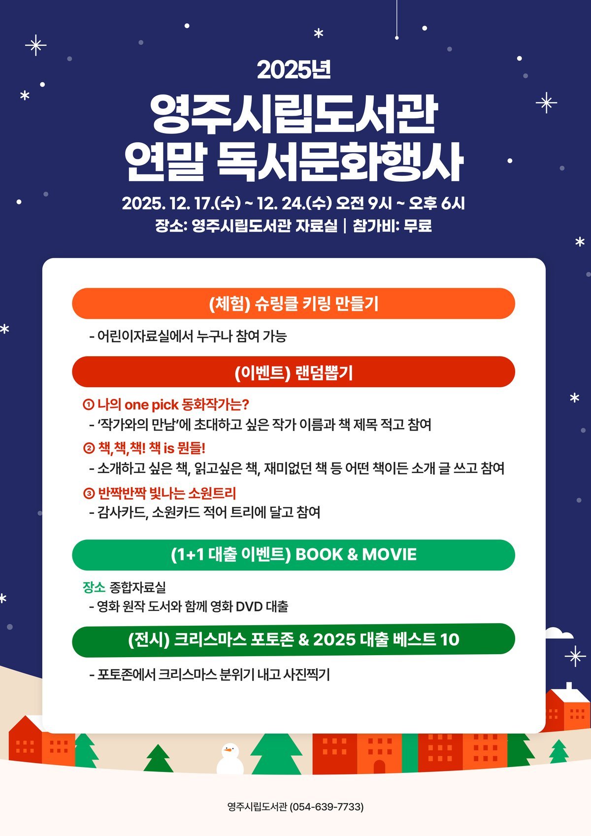 영주시립도서관, 연말맞이 독서문화행사 운영 (영주시 제공) [PEDIEN] 영주시립도서관이 12월 17일부터 24일까지, 시민들이 책과 함께 한 해를 마무리할 수 있도록 다채로운 연말맞이 독서문화 행사를 운영한다.이번 행사는 특별한 크리스마스 분위기 속에서 독서의 즐거움을 만끽하고, 풍성한 문화적 경험을 누릴 수 있도록 기획되었다.도서관은 행사 기간 동안 키링 만들기, 감사 카드 작성, 소원 카드 쓰기 등 온 가족이 함께 참여할 수 있는 체험 프로그램을 운영한다. 시민들은 책과 함께 DVD를 대여하는 특별한 경험도 할 수 있다.뿐만 아니라, 도서관에서의 소중한 추억을 사진으로 남길 수 있는 포토존도 마련하여 연말 분위기를 한층 더 고조시킬 예정이다.모든 프로그램은 사전 신청 없이 현장에서 자유롭게 참여할 수 있다. 도서관을 방문하는 시민 누구나 참여 가능하다.영주시립도서관 관계자는 "이번 행사를 통해 시민들이 도서관에서 따뜻한 연말을 보내고, 새해에도 다양한 독서문화 프로그램을 통해 지역 주민들의 문화 향유 기회를 확대해 나갈 것"이라고 밝혔다. -