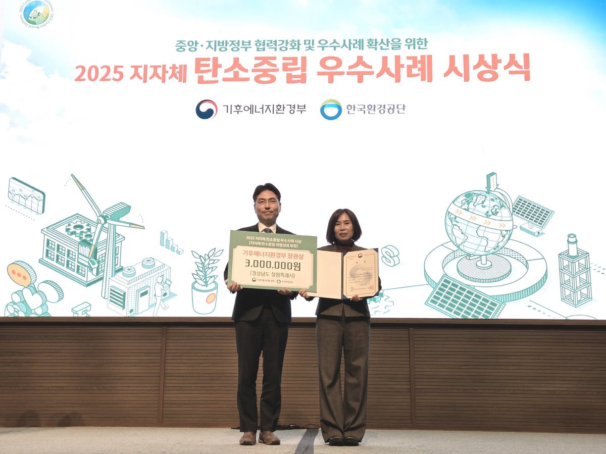 창원특례시 지자체 탄소중립 컨퍼런스 장관상 수상 기후대기과 (창원시 제공) [PEDIEN] 창원시가 '2025 지자체 탄소중립 컨퍼런스'에서 탄소중립 이행 성과를 인정받아 기후에너지환경부 장관상을 수상했다.이번 수상은 창원시가 탄소중립 사회로 나아가기 위한 노력의 결실로 평가된다.컨퍼런스는 중앙정부, 지자체, 기업, 시민사회가 탄소중립 실현 방안을 모색하는 자리로, 기후에너지환경부가 주관하고 한국환경공단이 주최했다.창원시는 '우리를 위한 우리 다운 선택, 탄소중립'이라는 슬로건 아래 지역 특성을 반영한 정책을 추진했다.특히 민관 협력, 시민 참여, 취약 계층 지원이라는 세 가지 핵심 영역에서 높은 평가를 받았다.박선희 창원특례시 기후대기과장은 컨퍼런스에서 창원시의 탄소중립 추진 전략과 성과를 발표하여 참석자들의 관심을 모았다.창원시의 주요 사업과 성과, 향후 계획 등이 소개됐다.이유정 기후환경국장은 시민과 함께 탄소중립 사회로 나아가는 창원시의 노력이 인정받아 기쁘다고 소감을 밝혔다.이어 이번 수상을 계기로 '지속가능한 탄소 중립 도시 창원'을 만들기 위해 최선을 다할 것을 다짐했다.이번 수상은 창원시가 대한민국 탄소중립을 선도하는 도시로서 지속 가능한 미래를 향해 나아가는 데 중요한 동기가 될 것으로 전망된다. -