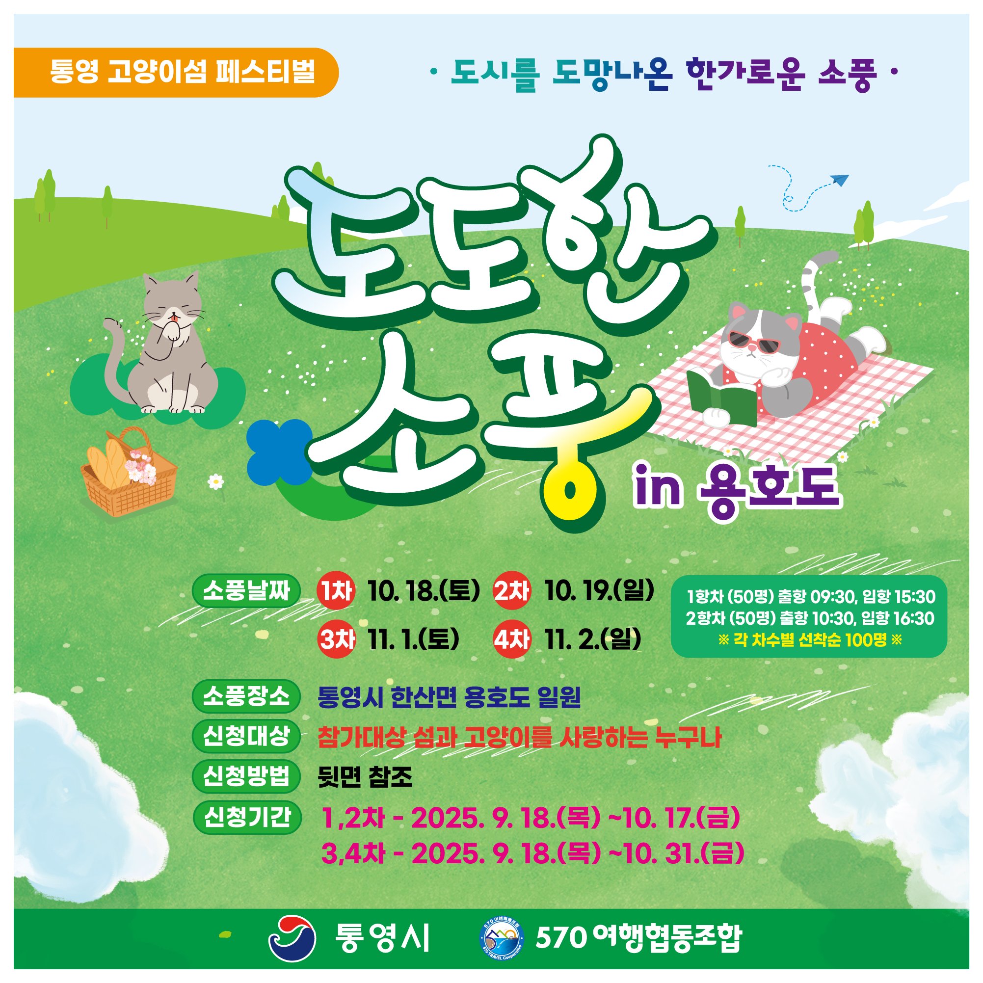 통영시, 도시를 떠나 고양이와 함께하는 치유 여행 (사진제공=통영시) [PEDIEN] 통영시가 가을을 맞아 용호도 일원에서 고양이와 사람이 공존하는 특별한 힐링 생태 축제를 개최한다. 시는 오는 10월 18일부터 11월 2일까지 총 4회에 걸쳐 ‘도도한 소풍 in 용호도’ 행사를 열고, 용호도를 K-관광 명소로 육성하는 사업에 박차를 가한다고 15일 밝혔다.이번 행사는 문화체육관광부의 남부권 광역관광 개발사업인 ‘통영 용호도 고양이섬 K-관광명소 육성 사업’의 일환으로 추진됐다. ‘도시를 도망나온 한가로운 소풍’이라는 의미를 담은 ‘도도한 소풍’은 단순한 여행을 넘어 생명 존중과 공존의 가치를 체험하는 데 중점을 뒀다.용호도는 통영시 공공형 고양이 보호분양센터(고양이학교)가 위치한 곳으로, 고양이와 사람이 함께 살아가는 ‘공존의 섬’으로 변화하고 있다는 평가다. 시는 이번 축제를 통해 섬마을의 여유로운 일상과 프로그램을 경험하길 기대하고 있다.참가자들을 위한 프로그램은 경연, 체험, 공존 등 세 가지 주제로 풍성하게 마련됐다. 주요 콘텐츠로는 어린이 그림 그리기, 포토시 대회 등 경연 프로그램과 고양이 장난감, 목걸이 만들기 등 체험 프로그램이 있다.특히 섬의 자연을 보존하고 공존의 의미를 되새기는 플로깅과 소리바다 등 자연 친화적 활동도 진행된다. 이와 함께 비빔밥, 샌드위치, 커피 등으로 구성된 소풍형 장터도 운영되어 방문객들의 편의를 돕는다.축제의 낭만을 더할 ‘고양이섬 작은 음악회’도 열린다. 감미로운 재즈, 어쿠스틱 기타 연주, 싱어송라이터 공연 등이 참가자들에게 섬마을의 여유로운 정취를 선사할 예정이다.주목할 점은 섬(용호도)과 육지부를 연결하기 위한 무료 고양이 특강이다. 1차 특강은 10월 18일 오후 4시 30분 통제영 인근 역사홍보관에서 열린다. 정경섭 강사가 ‘고양이는 우리를 어떻게 행복하게 해주는가’를 주제로 통영 고양이섬에서 찾는 공존의 미래를 조명한다.2차 특강은 11월 2일 오전 11시 리스타트플랫폼 1층에서 진행된다. 조윤주 수의사가 강연자로 나서 ‘좋은 날, 길고양이를 만나다’를 주제로 길고양이와의 올바른 공존 방법을 설명할 계획이다. -