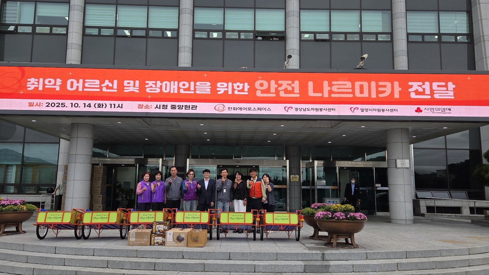 한화에어로스페이스 2사업장 관계자들이 밀양시를 방문해 안전나르미카 6대를 전달하고 있다 (사진제공=밀양시) [PEDIEN] 한화에어로스페이스 2사업장이 경상남도자원봉사센터와 함께 생계형 폐자원 수집 취약계층의 안전한 근로환경 조성을 위해 밀양시에 특수 제작된 ‘안전나르미카’ 6대를 기탁했다.이번 기탁은 폐자원 수집에 의존하는 어르신과 장애인 등 사회적 약자들이 보다 안전하게 자립 활동을 할 수 있도록 돕기 위한 기업의 사회공헌 활동의 일환이다. 밀양시자원봉사센터는 지난 14일 해당 물품을 전달받았다고 밝혔다.안전나르미카는 사용자의 편의와 안전에 초점을 맞춰 제작됐다. 어르신과 장애인이 사용하기 쉽도록 경량화했으며, 보관이 용이하도록 접이식 손잡이를 적용했다.특히 야간 활동 시 안전을 위해 태양광 경광등과 경적벨을 설치하고, 본체를 형광 도색하여 시인성을 높인 것이 특징이다. 수레와 함께 안전조끼, 자물쇠, 밧줄, 생필품 등도 함께 전달돼 수혜자들의 만족도를 높였다.이 사업은 한화에어로스페이스 2사업장 임직원들과 기술봉사팀이 직접 참여하는 재능기부 활동으로 2015년부터 꾸준히 이어져 왔다. 지금까지 경남 지역 18개 시·군에 총 328대의 안전나르미카를 제작해 보급했다.올해는 총 26대를 제작했으며, 이 중 6대가 밀양시에 전달됐다. 한화에어로스페이스 관계자는 “취약계층의 안전을 지키고 더 나은 근로환경을 지원하는 모범적인 사례가 되기를 기대한다”고 전했다.밀양시자원봉사센터 측은 “기업이 사회적 약자를 돕는 뜻깊은 나눔을 실천해 준 것에 감사하며, 이 사업이 지역사회에 긍정적인 영향을 미치고 있다”고 평가했다.
