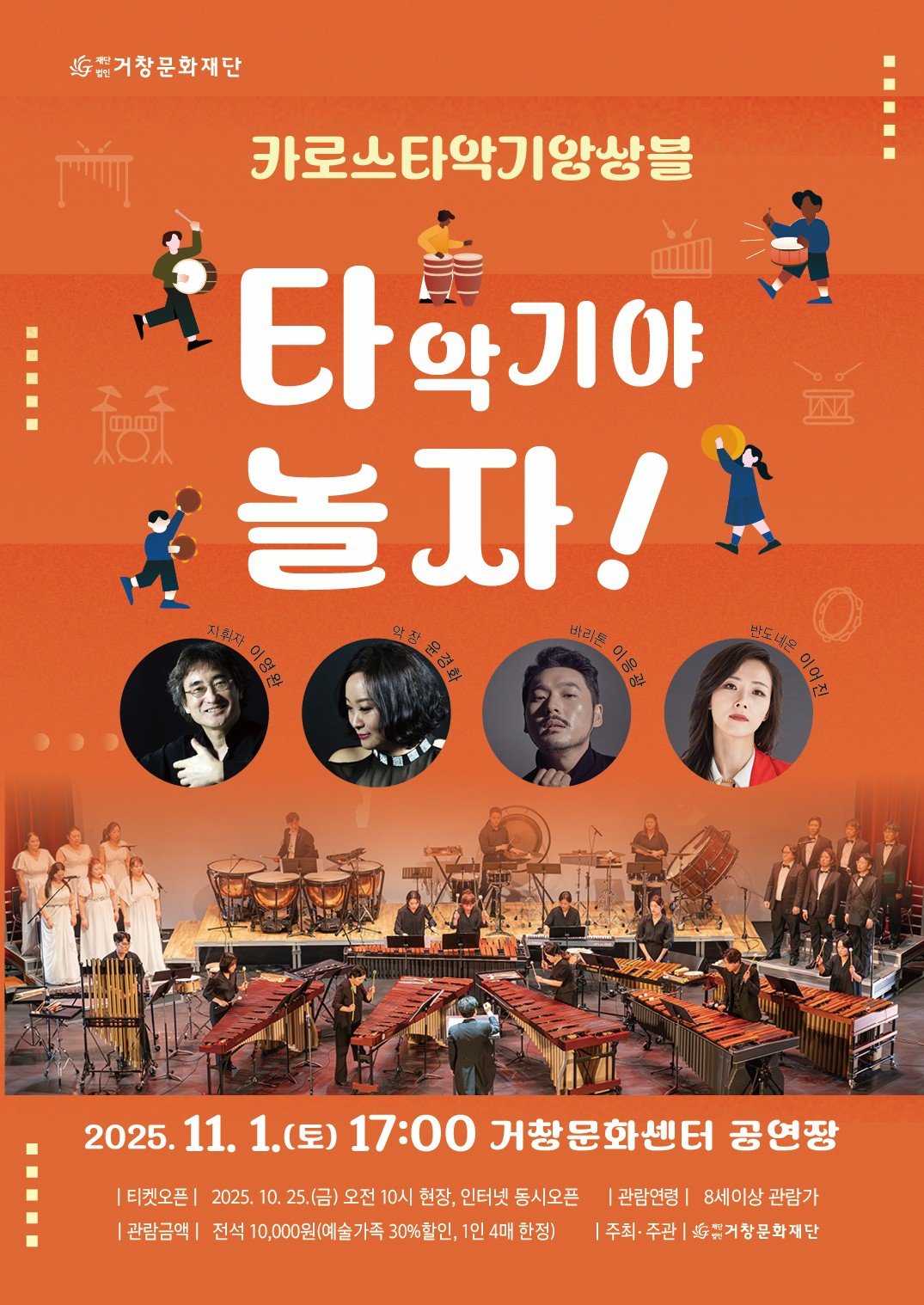 타악기야놀자 포스터 (사진제공=거창군) [PEDIEN] 거창문화재단이 오는 11월 1일 거창문화센터 공연장에서 세계적인 수준의 '카로스 타악기 앙상블'을 초청해 기획공연 '타악기야 놀자!'를 개최한다. 이번 공연은 클래식 명곡부터 대중적인 영화음악까지 타악기의 박진감 넘치는 사운드로 재해석하며, 남녀노소 누구나 즐길 수 있는 고품격 무대를 예고했다.카로스 타악기 앙상블은 마림바, 비브라폰, 차임 등 다양한 악기를 활용해 타악기 특유의 다채로운 음색과 생동감 넘치는 연주 기법을 선보이는 세계 최정상급 단체로 알려졌다. 특히 이번 공연은 단순히 듣는 것을 넘어 관객이 타악기를 직접 보고 듣는 악기 소개 시간을 포함하는 체험형 음악회로 기획돼 관객과의 소통을 극대화한다.레퍼토리는 대중에게 친숙한 곡들로 구성됐다. 'African Symphony'를 시작으로 클래식 명곡 'Canon', 영화 '캐리비안의 해적' OST, 오페라 '세빌리아의 이발사' 중 'Largo al factotum' 등 널리 알려진 곡들을 타악기 사운드로 새롭게 해석해 들려줄 예정이다.무대에는 한국을 대표하는 타악기 연주자 이영완 지휘자와 윤경화 악장을 비롯해 세계적인 바리톤 이응광, 반도네오니스트 이어진 등 국내외에서 활약하는 정상급 연주자들이 함께한다. 이들은 예술성과 대중성을 겸비한 고품격 무대를 완성할 것으로 기대된다.공연은 11월 1일 토요일 오후 5시에 열리며, 8세 이상 관람할 수 있다. 관람료는 전석 1만 원으로 책정돼 부담 없이 고품격 공연을 즐길 기회를 제공한다. 예매는 지난 10월 24일 오전 10시부터 거창문화재단 홈페이지와 거창문화센터 로비에서 진행되고 있으며, 재단 예술가족으로 가입하면 1년간 30% 할인 혜택을 받을 수 있다. -