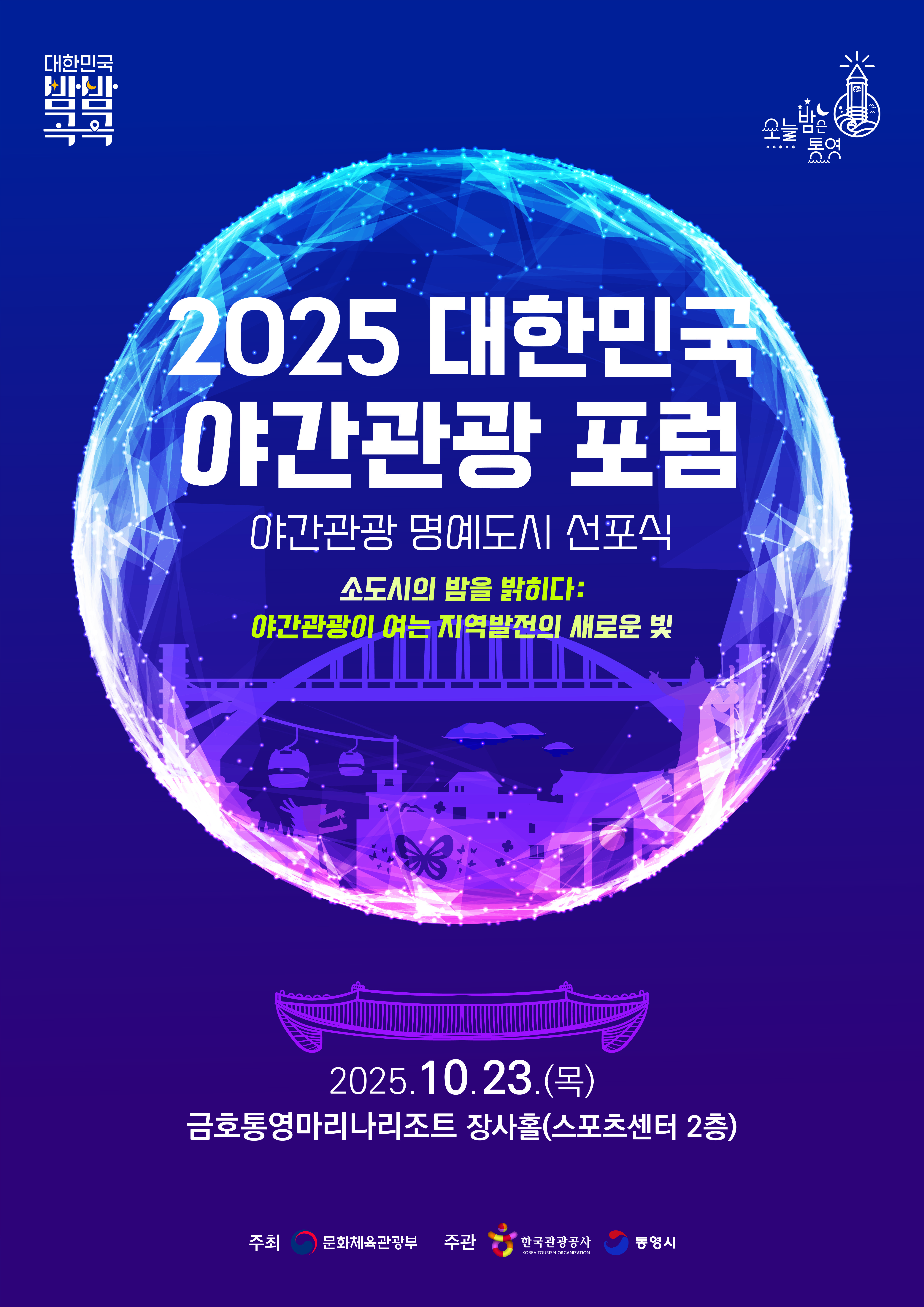 미래 100년의 도시 통영 야간관광이 여는 지역발전의 새로운 빛 (사진제공=통영시) [PEDIEN] 대한민국 제1호 야간관광 특화도시인 통영시가 지난 4년간의 성과를 공유하고 야간관광을 통한 지역 발전 전략을 모색하는 대규모 포럼을 개최한다. 통영시는 오는 23일 통영 금호마리나리조트에서 문화체육관광부와 한국관광공사가 공동 주관하는 ‘2025 대한민국 야간관광 포럼 및 명예도시 선포식’을 연다고 밝혔다.이번 행사는 통영시가 2022년 문체부의 야간관광 특화도시로 선정된 이후 추진해 온 사업의 결실을 대내외에 알리고, 향후 대한민국 야간관광을 선도하는 도시로서의 위상을 확고히 하기 위해 마련됐다. 시는 ‘투나잇 통영(Tonight Tongyeong)’이라는 독자적인 브랜드를 구축하고 다양한 야간 콘텐츠를 선보이며 지역 관광 경쟁력을 크게 끌어올렸다는 평가를 받는다.포럼은 ‘소도시의 밤을 밝히다: 야간관광이 여는 지역발전의 새로운 빛’을 주제로 진행된다. 문체부, 한국관광공사 관계자를 비롯해 전국 지자체 및 업계 전문가 100여 명이 참석해 지역소멸 대응과 지속가능한 발전 전략을 심도 있게 논의할 예정이다.특히 이번 포럼에서는 국내외 야간관광 정책 및 성공 사례가 공유된다. 일본 슈큐도쿠대학교 치바치에코 교수는 일본 소도시 사례를 중심으로 야간관광 활성화 방안을 제시한다.이어 국내 첫 이벤트 포털 웹사이트 이벤트넷 엄상용 박사는 야간관광을 통한 소도시 재생 및 소상공인 연계 활성화 방안을 소개하며, 프로젝트 수 정란수 대표는 야간관광 콘텐츠의 지역 활성화 성과와 미래 전략을 발표한다. 발제 이후에는 국내 야간관광 발전을 위한 정책적, 실무적 대안을 찾는 패널 토론이 이어진다.포럼과 함께 진행되는 ‘야간관광 명예도시 선포식’은 통영시의 미래 비전을 담고 있다. 시는 이번 선포식을 통해 ‘미래 100년의 도시, 통영’이라는 비전 아래 지속가능한 야간관광 정책을 추진, 대한민국 최초이자 최고의 야간관광 도시로 도약하겠다는 의지를 공식적으로 선포할 계획이다.통영시 관계자는 “지난 4년간 축적한 성과를 바탕으로 앞으로도 대한민국 야간관광을 선도하는 도시로 성장할 것”이라며 “야간관광을 지역발전의 핵심 동력으로 삼아 도시 브랜드와 지역경제를 함께 성장시켜 나가겠다”고 강조했다. -